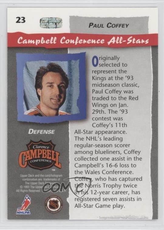 1992-93 Upper Deck - All-Stars #23 Paul Coffey - Ice Hockey Card - Featuring the NHL All-Star Team - Featuring Paul Coffey Search for more: 1992-93 Upper Deck Search for more: 1992-93 Upper Deck - All-Stars View all of our Listings Auctions Buy It Now About Us Located in the beautiful Pacific Northwest, COMC (Check Out My Cards) is the world's largest consignment service for trading card singles. More than 10,000 people have used our consignment service to list over 50 million trading cards. Find out how we can help you consign your items on eBay by contacting us through eBay messaging. COMC -- "The Safe & Easy Way to Buy & Sell" Representative Image - Select Specific Item above to see image of actual item Representative Image - Select Specific Item above to see image of actual item Raw Condition for Modern Cards Unless otherwise noted, raw modern cards are listed in Near Mint-Mint condition or better. A NM-MT card appears to be Mint at first glance, but upon closer inspection, may exhibit some of the following: minor print defects (e.g. roller marks, print line, dimple), minor scratches, slight edge wear, and slight corner wear. Centering is clearly visible in the images provided and does not factor into our condition assessment. Raw Condition for Vintage Cards Unless otherwise noted, raw vintage cards are listed in Excellent condition or better. An EX card may exhibit some of the following: minor rounding of corners, surface wear, print defects, light scratches, and slight edge wear/chipping. Centering is clearly visible in the images provided and does not factor into our condition assessment. Domestic Shipping Combined shipping for multiple items is available. To receive combined shipping, please ensure all desired items are in your eBay shopping cart before proceeding to checkout. eBay limits orders to 40 items per order. We automatically combine multiple orders placed on the same day. If you place multiple orders on the same day, please contact us to request a refund of applicable shipping costs. Signature confirmation may be required on invoices over $400. All cards are protected and shipped securely. International Shipping COMC offers eBay's International Shipping (EIS) for international orders under $2,500* (see country exceptions below). All duties and import fees are paid at checkout; in the rare event that there are additional import fees upon delivery, these are borne by the buyer. EIS packages route through a shipping hub in Erlanger, KY before shipping to their final destination. Please note that EIS does not allow for combined shipments. The shipping rates are determined by eBay and cannot be adjusted. *Maximum sale price exceptions: Colombia, Kuwait ($2,000); Taiwan ($1,539); Chile, Costa Rica, Guatemala, Honduras, Trinidad and Tobago ($1,000); Antigua and Barbuda, Aruba, Belize, Dominica, Grenada, Philippines, Saint Kitts and Nevis, Saint Lucia, Montserrat, Turks and Caicos Islands ($500); Dominican Republic, El Salvador ($200). Please request a shipping quote through eBay messaging for orders that exceed the maximum sale price supported by eBay's International Shipping. You will be responsible for all duties and import fees for international orders shipped outside the EIS. All cards are protected and shipped securely. Payment COMC does not accept offers on our cards through our eBay storefront. COMC utilizes eBay’s managed payments system. If you are experiencing difficulties making a payment, please contact eBay for assistance. Return Policy Returns are only accepted on the rare occasion the item is not as described. If you are making a return, please initiate the return process through eBay so a mailing label can be provided for you. Prior to listing, our expert team carefully assessed this item to represent it accurately. Please review the description and high-definition images prior to purchasing to ensure this item meets your satisfaction. We welcome you to contact us if you have further questions about this item. Trust and Integrity COMC carefully assesses each item consigned to us to prevent fraudulent items from entering the marketplace. If you believe an item offered on COMC may be fraudulent, please contact us with details so we can investigate the issue. Items we determine are outside our supported items policy may be removed. Last Modified: 6/7/2025 7:28:35 AM PDT