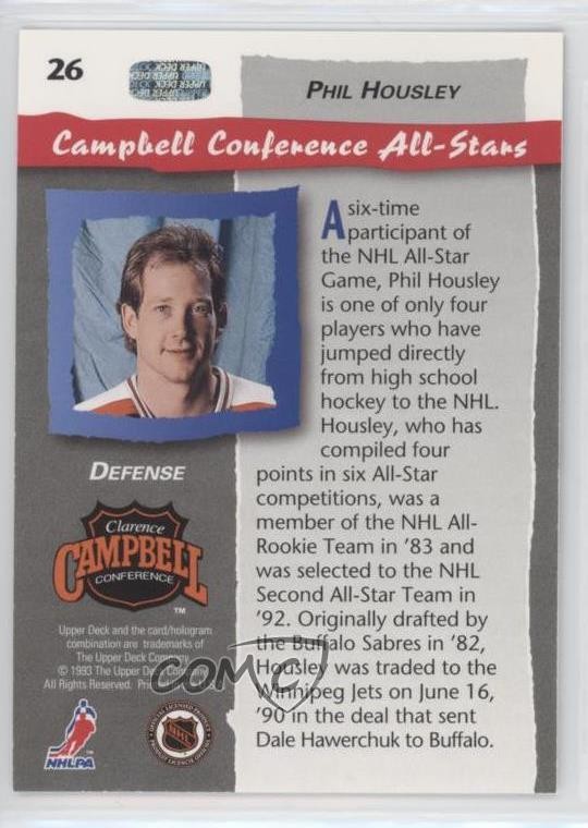 1992-93 Upper Deck - All-Stars #26 Phil Housley - Ice Hockey Card - Featuring the NHL All-Star Team - Featuring Phil Housley Search for more: 1992-93 Upper Deck Search for more: 1992-93 Upper Deck - All-Stars View all of our Listings Auctions Buy It Now About Us Located in the beautiful Pacific Northwest, COMC (Check Out My Cards) is the world's largest consignment service for trading card singles. More than 10,000 people have used our consignment service to list over 50 million trading cards. Find out how we can help you consign your items on eBay by contacting us through eBay messaging. COMC -- "The Safe & Easy Way to Buy & Sell" Representative Image - Select Specific Item above to see image of actual item Representative Image - Select Specific Item above to see image of actual item Raw Condition for Modern Cards Unless otherwise noted, raw modern cards are listed in Near Mint-Mint condition or better. A NM-MT card appears to be Mint at first glance, but upon closer inspection, may exhibit some of the following: minor print defects (e.g. roller marks, print line, dimple), minor scratches, slight edge wear, and slight corner wear. Centering is clearly visible in the images provided and does not factor into our condition assessment. Raw Condition for Vintage Cards Unless otherwise noted, raw vintage cards are listed in Excellent condition or better. An EX card may exhibit some of the following: minor rounding of corners, surface wear, print defects, light scratches, and slight edge wear/chipping. Centering is clearly visible in the images provided and does not factor into our condition assessment. Domestic Shipping Combined shipping for multiple items is available. To receive combined shipping, please ensure all desired items are in your eBay shopping cart before proceeding to checkout. eBay limits orders to 40 items per order. We automatically combine multiple orders placed on the same day. If you place multiple orders on the same day, please contact us to request a refund of applicable shipping costs. Signature confirmation may be required on invoices over $400. All cards are protected and shipped securely. International Shipping COMC offers eBay's International Shipping (EIS) for international orders under $2,500* (see country exceptions below). All duties and import fees are paid at checkout; in the rare event that there are additional import fees upon delivery, these are borne by the buyer. EIS packages route through a shipping hub in Erlanger, KY before shipping to their final destination. Please note that EIS does not allow for combined shipments. The shipping rates are determined by eBay and cannot be adjusted. *Maximum sale price exceptions: Colombia, Kuwait ($2,000); Taiwan ($1,539); Chile, Costa Rica, Guatemala, Honduras, Trinidad and Tobago ($1,000); Antigua and Barbuda, Aruba, Belize, Dominica, Grenada, Philippines, Saint Kitts and Nevis, Saint Lucia, Montserrat, Turks and Caicos Islands ($500); Dominican Republic, El Salvador ($200). Please request a shipping quote through eBay messaging for orders that exceed the maximum sale price supported by eBay's International Shipping. You will be responsible for all duties and import fees for international orders shipped outside the EIS. All cards are protected and shipped securely. Payment COMC does not accept offers on our cards through our eBay storefront. COMC utilizes eBay’s managed payments system. If you are experiencing difficulties making a payment, please contact eBay for assistance. Return Policy Returns are only accepted on the rare occasion the item is not as described. If you are making a return, please initiate the return process through eBay so a mailing label can be provided for you. Prior to listing, our expert team carefully assessed this item to represent it accurately. Please review the description and high-definition images prior to purchasing to ensure this item meets your satisfaction. We welcome you to contact us if you have further questions about this item. Trust and Integrity COMC carefully assesses each item consigned to us to prevent fraudulent items from entering the marketplace. If you believe an item offered on COMC may be fraudulent, please contact us with details so we can investigate the issue. Items we determine are outside our supported items policy may be removed. Last Modified: 6/7/2025 7:28:46 AM PDT