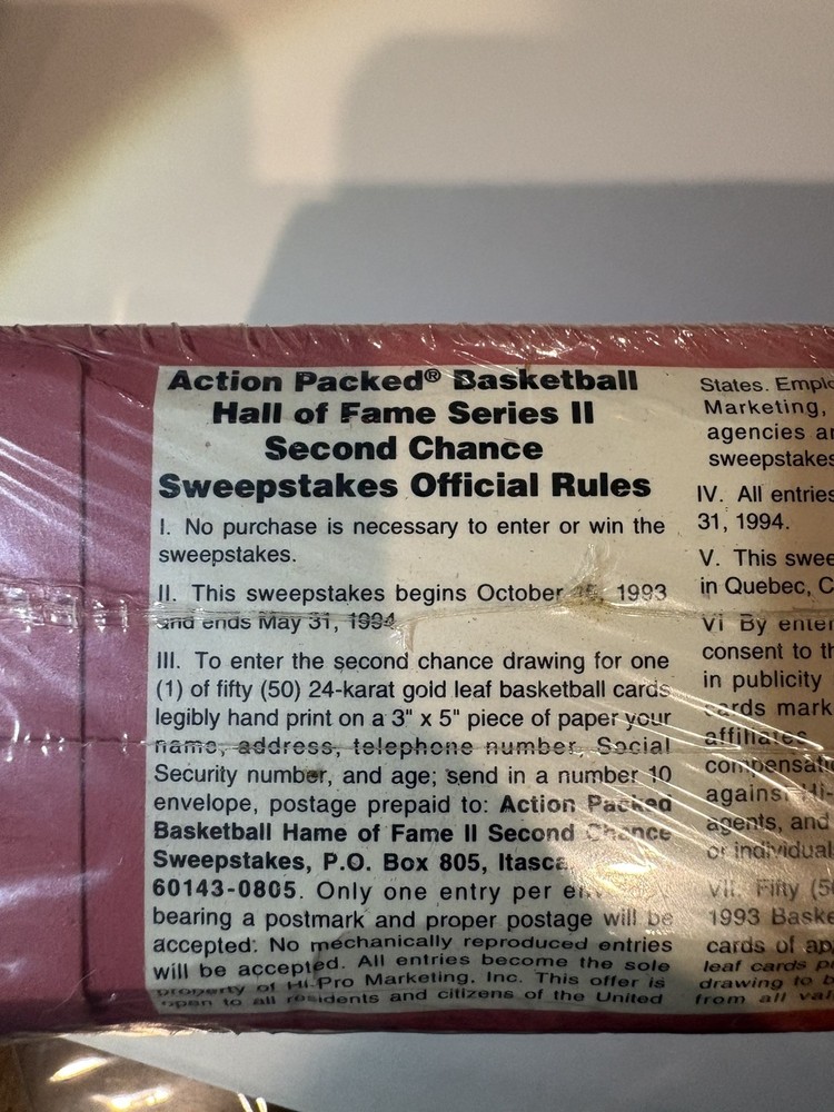 Up for sale is a 1993 Action Packed Basketball Hall of Fame Series II factory sealed box containing 24 unopened packs (6 cards per pack). This box is still sealed in its original factory shrink wrap, as it left the distributor. The shrink wrap is intact with no tears through the seal, confirming it has never been opened or searched. According to the box, this series includes the chance to pull randomly inserted 24-karat gold leaf basketball cards, along with Hall of Fame players and special themed subsets. These gold leaf cards were produced in limited quantities and are one of the highlights of the product. Condition notes (important): • Original factory shrink wrap remains on the box • Visible shelf wear and age-related wear to the box and wrap • No water damage, no crushing, no major holes through the seal This is a true vintage sealed product from the early 1990s, making unopened boxes increasingly hard to find. The sealed packs inside remain untouched. Please review all photos carefully, as they are part of the description. Item is guaranteed factory sealed and will be packed securely for shipping. A great piece for collectors, nostalgia buyers, or anyone looking to open vintage packs with a chance at NBA gold leaf inserts.