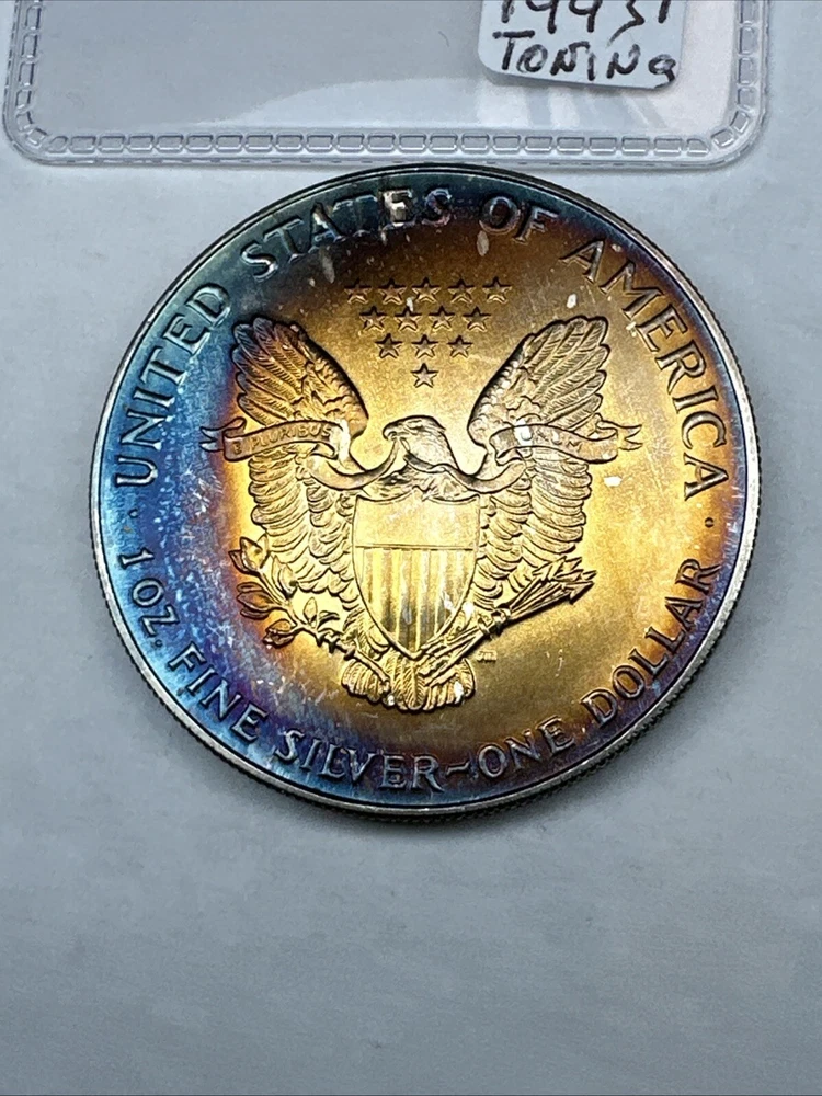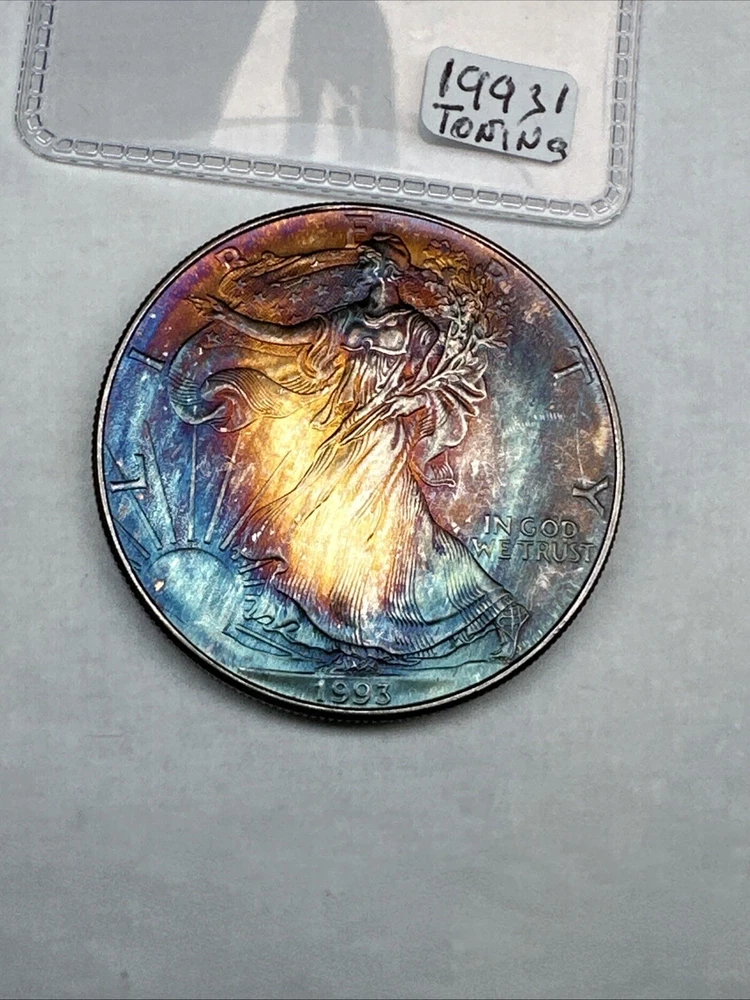 This is a 1993 American Silver Eagle coin minted by the U.S. Mint. It contains 1 oz of .999 fine silver with cool rainbow toning. The coin is uncirculated and comes in ungraded condition. It features the iconic American Eagle design and is a popular choice among bullion collectors and investors. Cool Rainbow Monster Toning.
