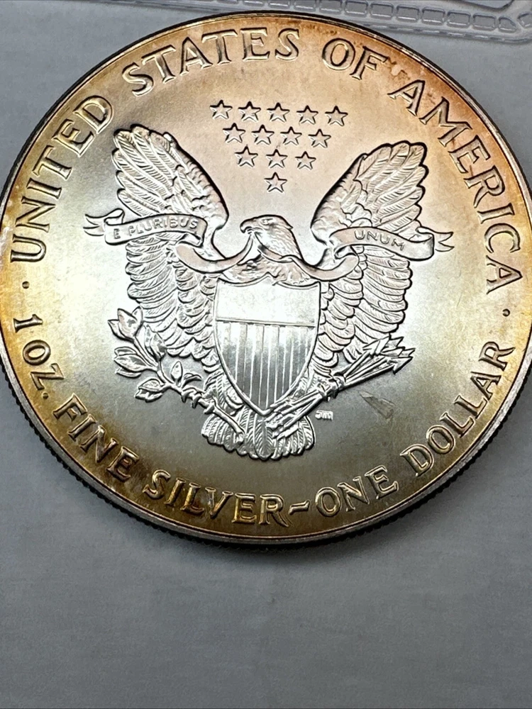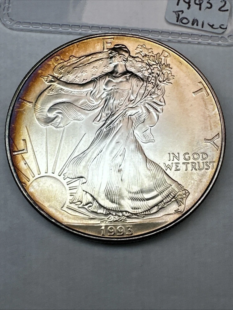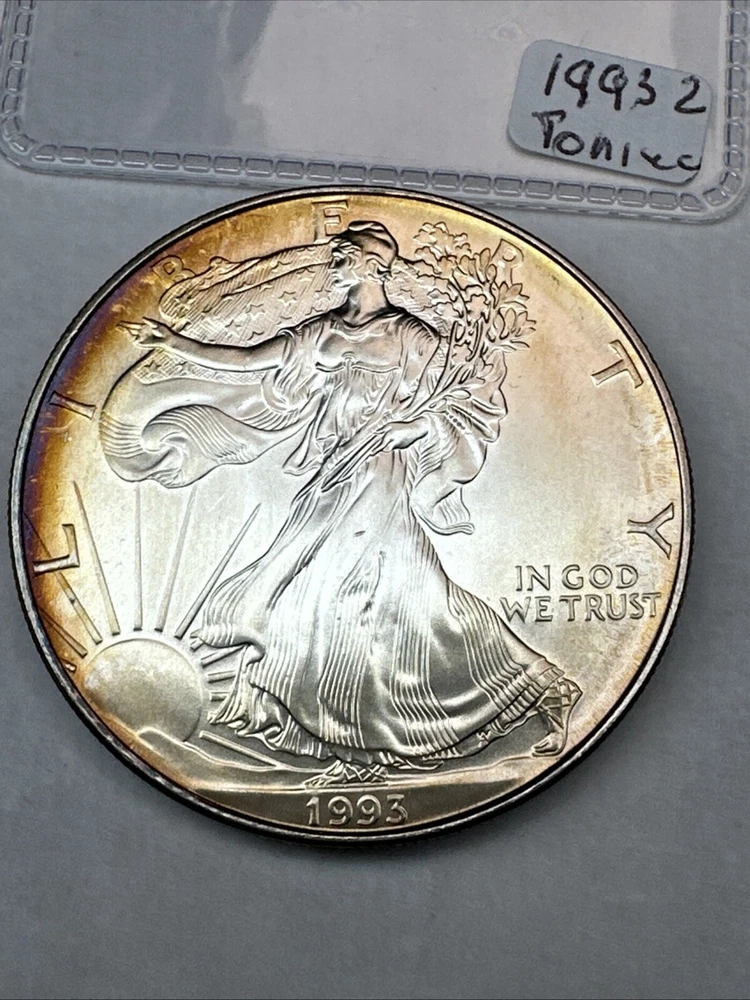 This is a 1993 American Silver Eagle coin, minted by the U.S. Mint. It contains 1 oz of 0.999 fine silver with cool toning. The coin features a depiction of Lady Liberty on the obverse and a heraldic eagle on the reverse. It is uncertified and has a total precious metal content of 1 oz.