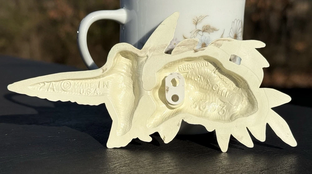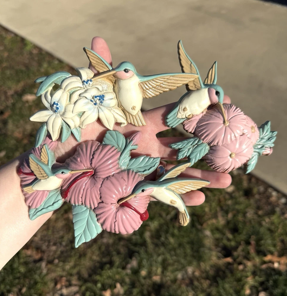 Adorable hummingbird wall decor, this is a set of 3. Made by Burwood in 1993 USA. All three hang on the wall and are light weight. No chips or cracks on any piece. Good used condition. Back has paint wear from production. All have been cleaned for your convenience. Does not come with original box or paperwork. Mug in background is prop only does not come with this lot. Please see all photos before purchasing. Thanks for looking and supporting small business. Measurements: First hummingbird is 6.5” Inches in length and 4” inches in width. Second hummingbird is 5 3/4” inches in length and 3” Inches in width. Third hummingbird is 5” inches in length and 3 3/4” Inches in width.