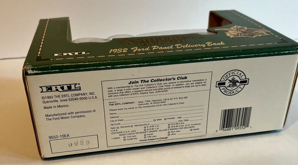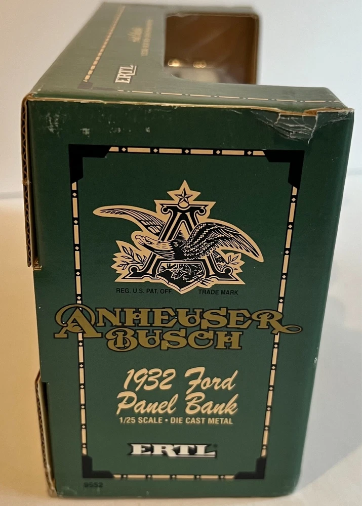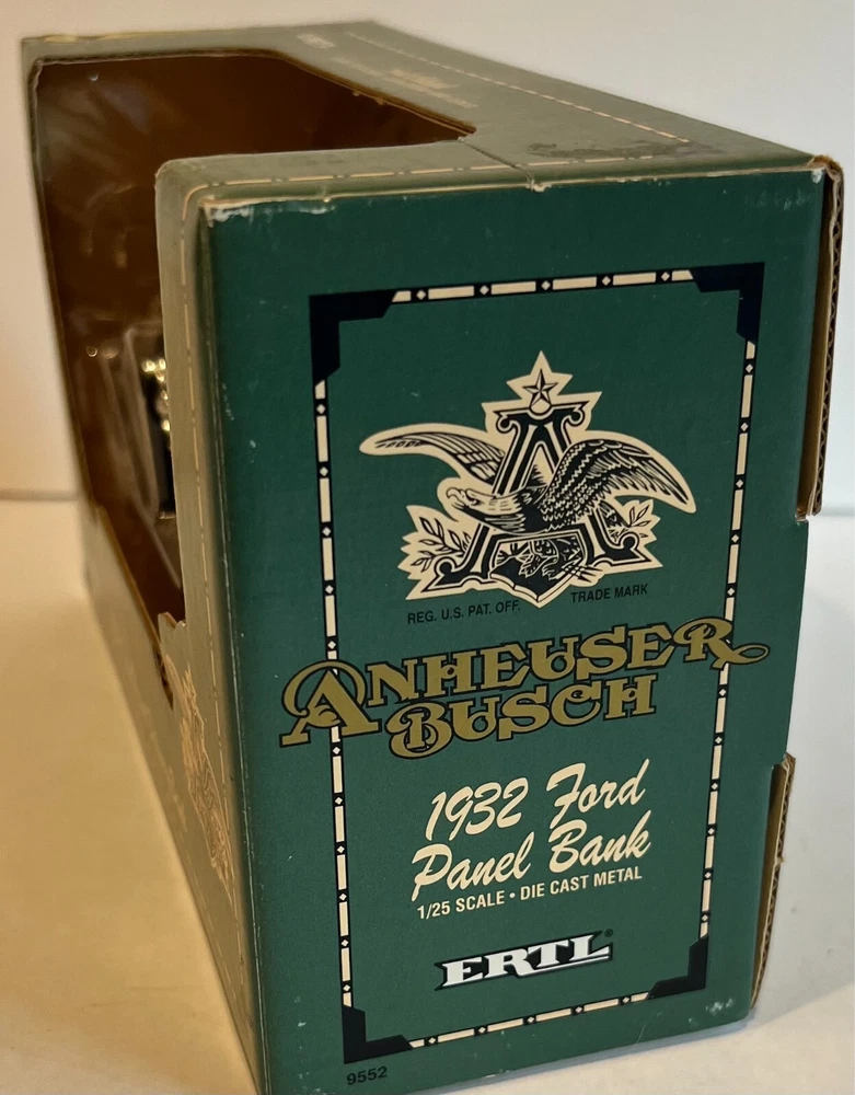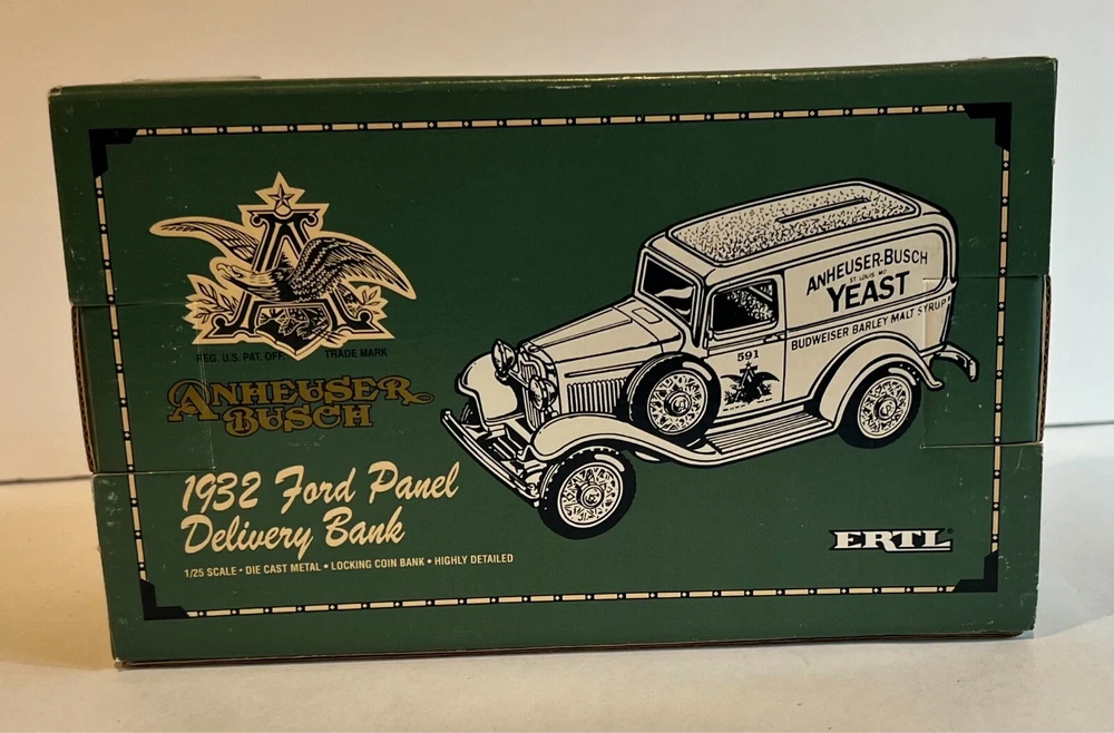 This Ertl 9552 diecast bank is a 1/25 scale model of the 1932 Ford Panel Delivery truck, sponsored by Anheuser-Busch. The blue truck is made of metal and has a removable lid that opens to reveal a compartment for storing coins. The bank is part of the Transportation series and was manufactured in Mexico in 1993. It features intricate details such as the Ertl brand logo and the Anheuser-Busch series logo. This item is recommended for ages 14 and up and is a great addition to any collection.