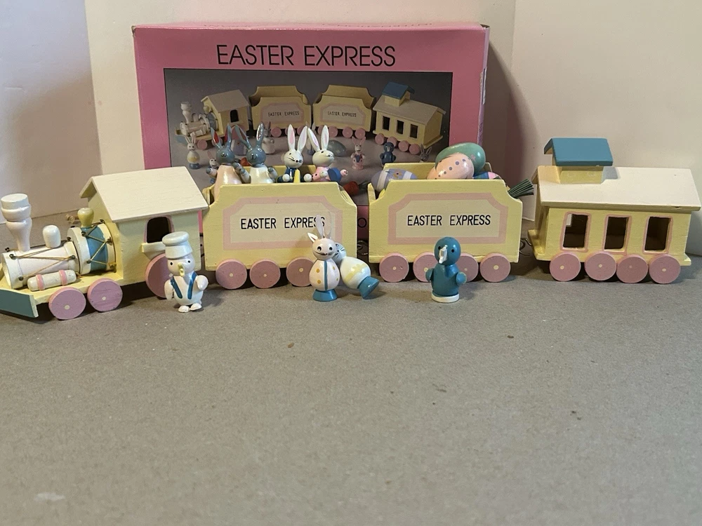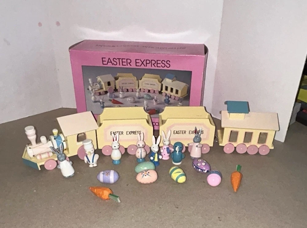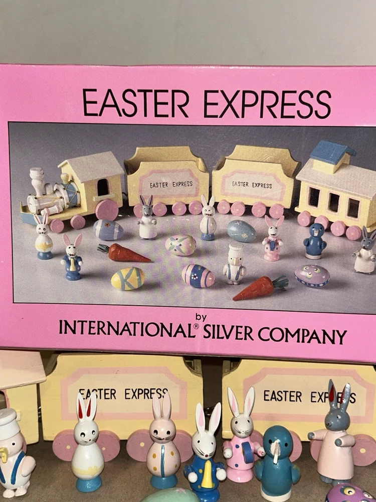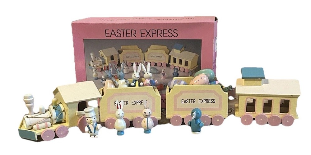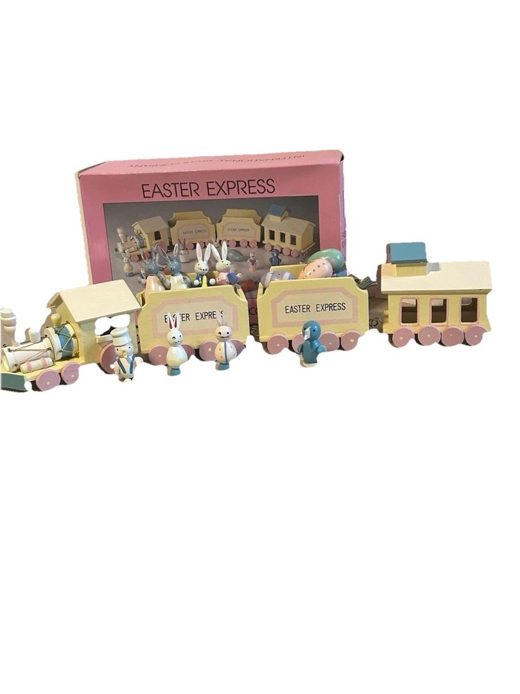 The 1993 Easter Express Wooden Train is a complete 20 piece set manufactured by International Silver Company. This collectible set features a primitive design with a multicolor Easter theme, making it a perfect addition to any holiday decor collection. Made of wood and originating from China in the 1990s, this vintage set is sure to bring nostalgia and charm to any train enthusiast or collector. The original box adds to its authenticity and display value.