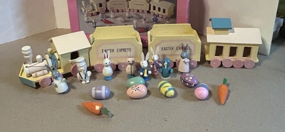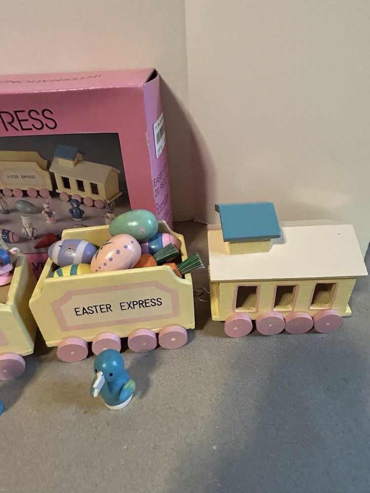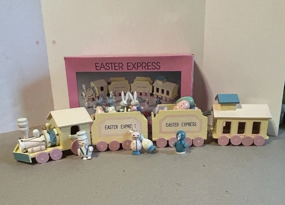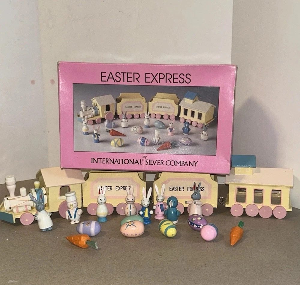 The 1993 Easter Express Wooden Train is a complete 20 piece set manufactured by International Silver Company. This collectible set features a primitive design with a multicolor Easter theme, making it a perfect addition to any holiday decor collection. Made of wood and originating from China in the 1990s, this vintage set is sure to bring nostalgia and charm to any train enthusiast or collector. The original box adds to its authenticity and display value.