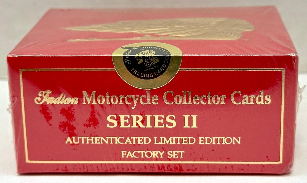 Description: Indian Motorcycle Collector Cards Series Two Factory Card Set Contents: 28 card factory set, includes game card, hologram, authenticity card and bonus Indian Motorcycle bandana. Manufacturer: Indian Motorcycle Trading Card Co, 1993. Condition: New, factory sealed.