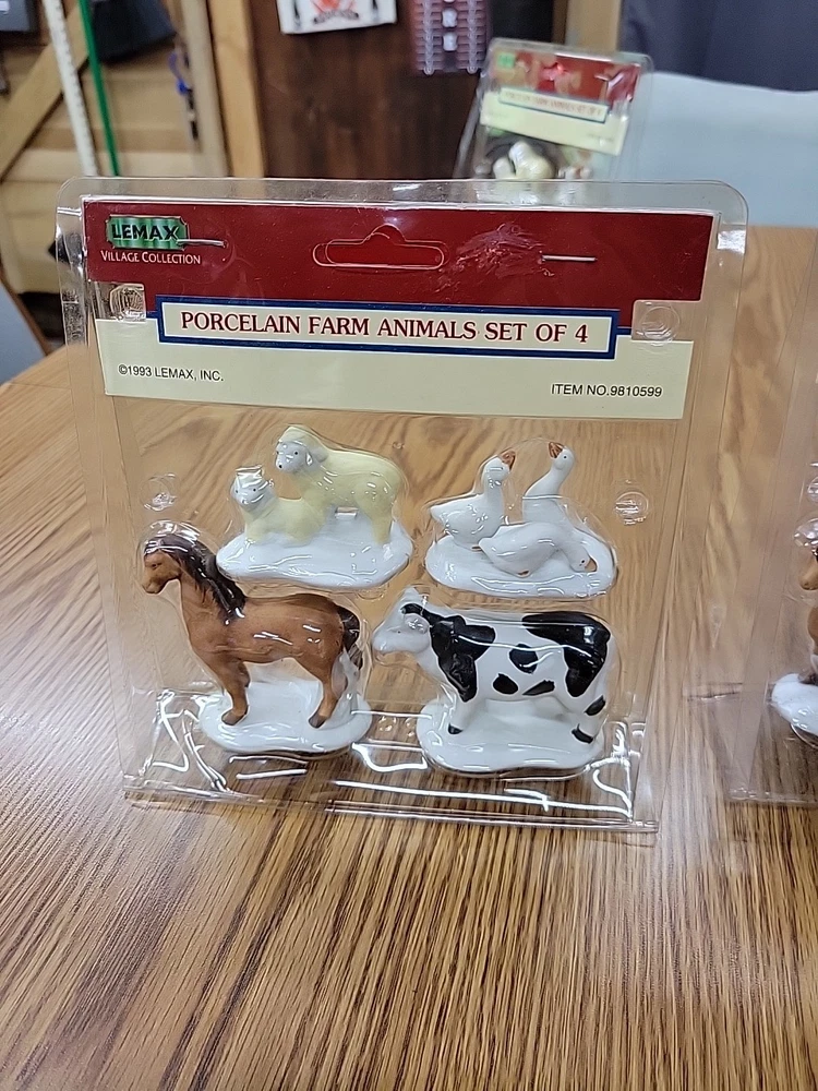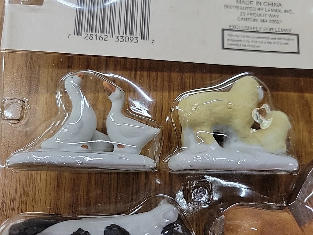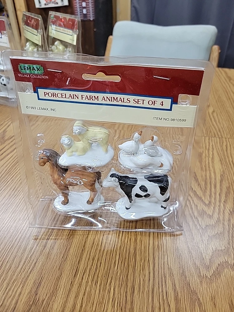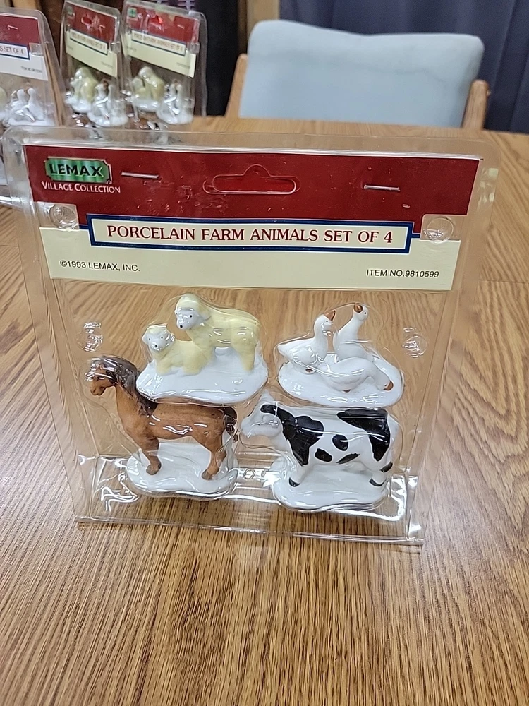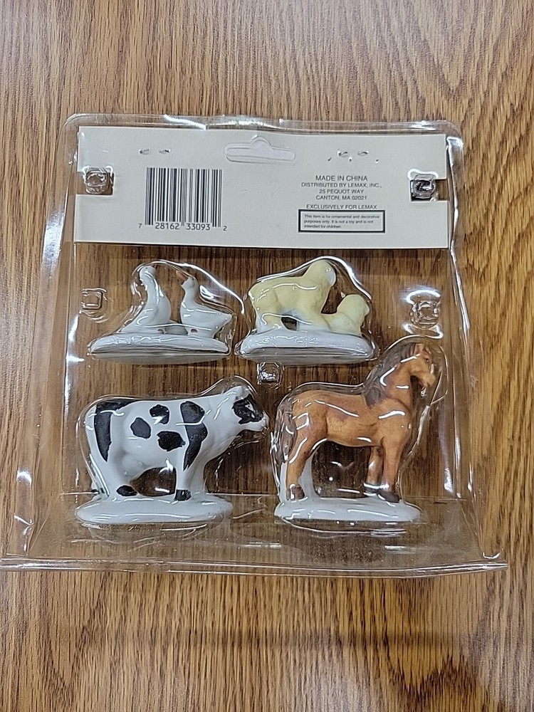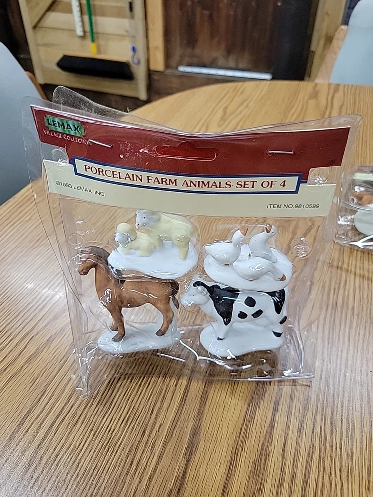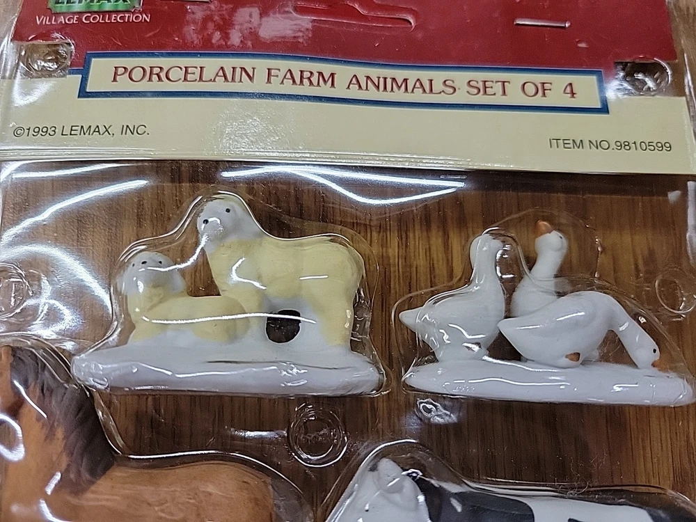 one package of porcelain farm animals the plastic on the packaging has melted the 1993 Lemax Porcelain Farm Animal set includes 4 small figurine characters from the Village Collection, featuring farm animals in porcelain material. These collectible items are part of the Christmas Village theme, perfect for seasonal decor in the living room. The colorful multicolor porcelain finish adds a charming touch to the 1980s style collection, making them a delightful addition to any holiday display. Made in China by the Lemax brand, these original Farm Animals are a nostalgic piece from the current time period, ideal for collectors and enthusiasts of holiday and seasonal decor.