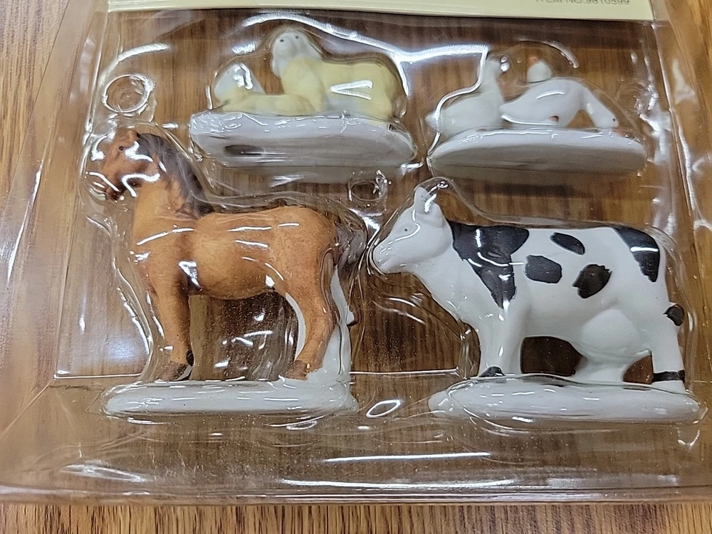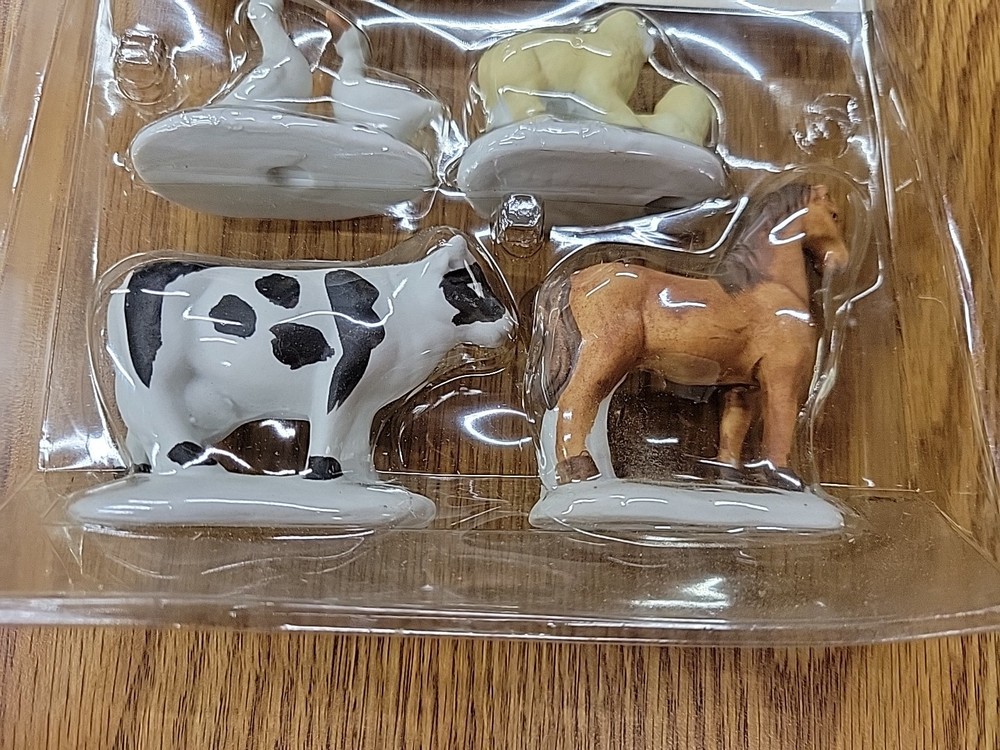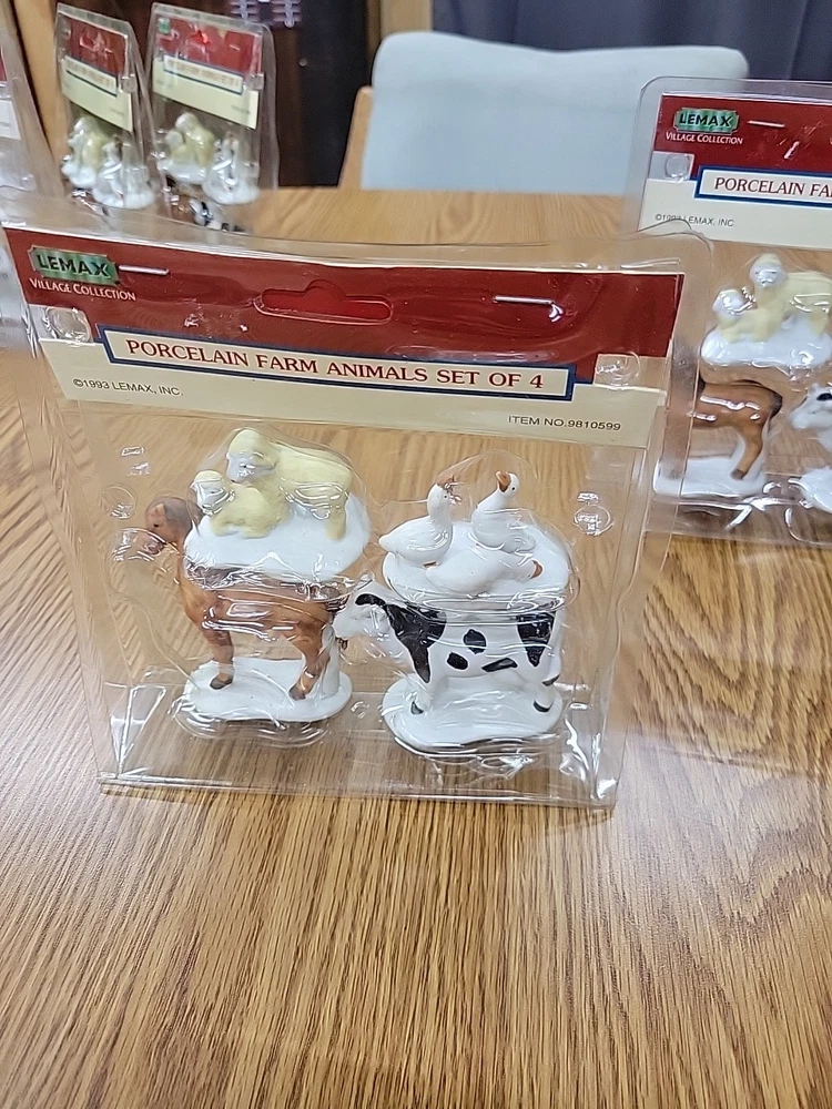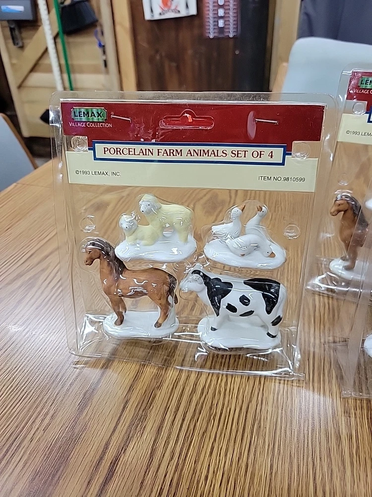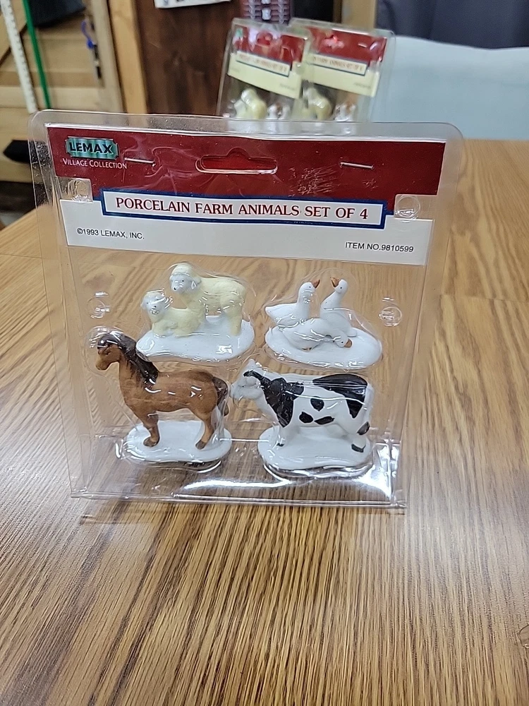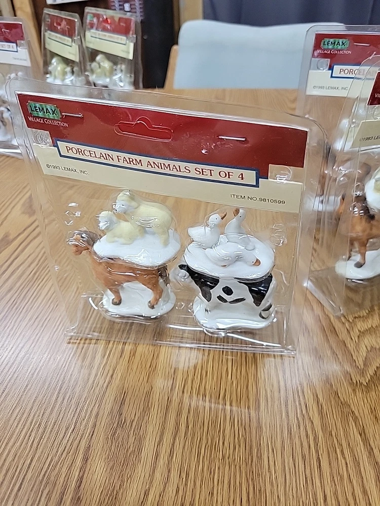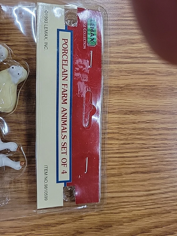 one package of porcelain farm animals the plastic on the packaging has melted the 1993 Lemax Porcelain Farm Animal set includes 4 small figurine characters from the Village Collection, featuring farm animals in porcelain material. These collectible items are part of the Christmas Village theme, perfect for seasonal decor in the living room. The colorful multicolor porcelain finish adds a charming touch to the 1980s style collection, making them a delightful addition to any holiday display. Made in China by the Lemax brand, these original Farm Animals are a nostalgic piece from the current time period, ideal for collectors and enthusiasts of holiday and seasonal decor.