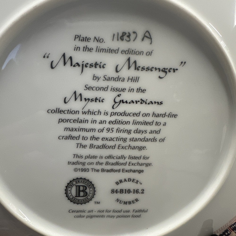 The 1993 Bradford Exchange Mystic Guardians "Majestic Messenger" by Sandra Hill is a collector plate that falls under the category of decorative collectibles. Produced in the art pottery style during the 1990s, this piece reflects Native American culture through its design. As part of the Bradford Exchange brand, this collector plate captures the essence of mysticism and spirituality with its intricate details and symbolism. Perfect for collectors of unique and culturally inspired items, this piece offers a touch of history and artistry to any collection.