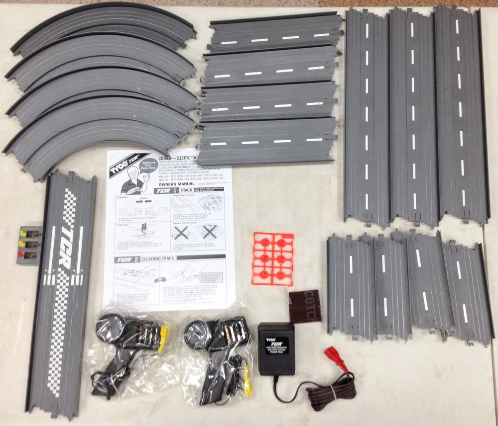 This listing is ONE (1) TYCO TCR, Total Control Racing, vintage 1993 Slotless HO scale slot car RACE SET. The components are all New Old Factory Stock that was originally intended to be used to assemble race sets. All track needs some scotch-brite pad brightening of the rails. WD-40 on a rag will help rejuvenate the track appearance & will help to repel moisture. The TYCO TCR system will accept vehicles like Aurora Speedsteer or Ideal TCR as well. On my web site, under guides, i have several in depth essays on TCR racing. The AC powered system works well & has a degree of difficulty that is unexpected. Although the entire track system has integrated guardrails, flying off the track is still probable at higher speeds. Shifting lanes is actuated with a steering wheel on the controller. Applying the wheel while going too slow results in a vehicle stall; do it too late, & the corner wall divider, takes you out. Adding a JAM (available separate) car creates a situation where one has to get around the moving obstacle! Using a second JAM vehicle (available separate) allows one car to go in each direction to warm up the track. JAM vehicles are very inexpensive. Typical is a Mustang 5.0 or an Emergency Van. TCR RACING IS A HOBBY & NOT A TOY. Adult supervision, setup & participation are CRUCIAL to a good user experience. Everything is included to get started. Parts, Vehicles & Track Accessories are widely available. INCLUDED IN THIS LISTING ARE: (2) TCR Race Cars, (1) 15" Terminal Straight Track, (3) 15" Straight Tracks, (6) 9" Straight Tracks, (2) 6" Straight Tracks, (4) 1/4 9" Curves, (2) Speed Controllers, (1) AC Transformer, (6) Obstacle Pylons & a Scotch-Brite cleaning pad. Also included are some free chassis tune up parts! Sold as is. Descriptions are very accurate; No Returns. PLEASE ASK QUESTIONS BEFORE YOU BUY IF YOU ARE UNSURE. We ship promptly & professionally. We happily combine orders & refund any excess s/h immediately upon shipping. We can always provide tracking. I charge $1 for expert handling/packaging, & actual shipping. We ship out of the country almost daily. Please refer to our feedback, social media or time selling HO slot cars for assurances of a good honest deal. Happy motorin' & thanks S'lots from Bob at Slot Car Central in SYR. We Know H.O.