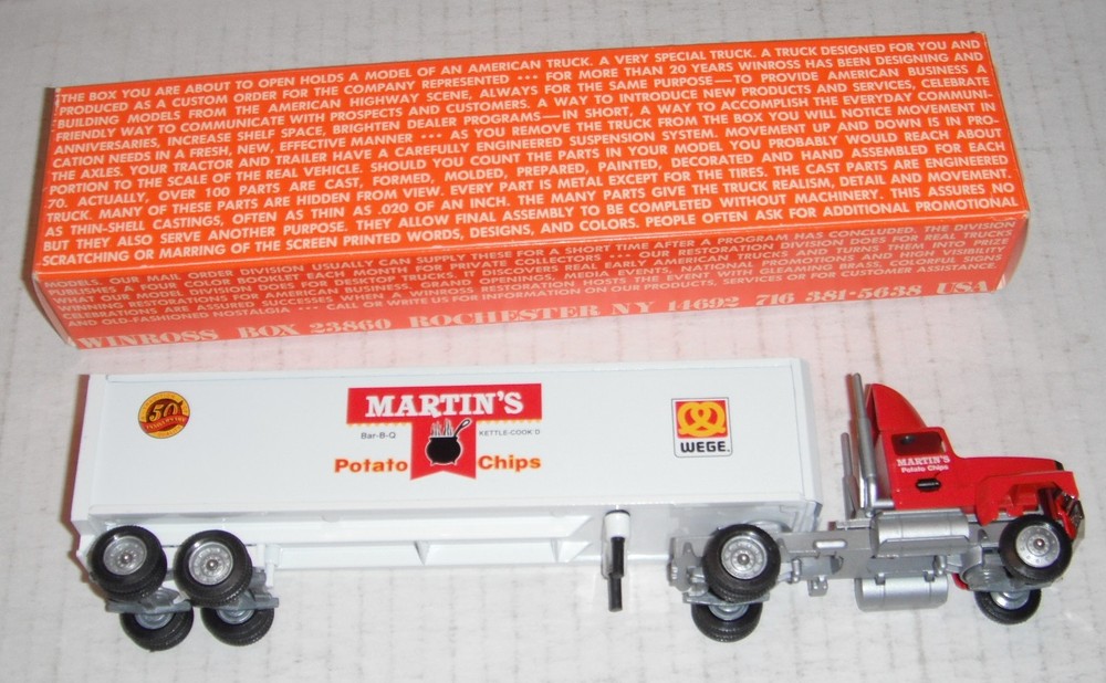 ITEM DESCRIPTION:: ---- Winross truck from Martin's Chips in Thomasville, Pa (near York)....Truck is like new and look like it was stored in the box over the years.. Nothing is broke or missing on the trucks, though there may be some minor paint loss at the pin connection area.. the original box is decent, but may have some wear , writing or tape....Truck was made in the USA to 1:64 scale....... ----1993 MARTIN'S CHIPS--WEGE PRETZELS.....Tractor Trailer with a RED Ford tractor............approx. 10.25" long, 2.25" high, 1.5" wide... ---All items must be mailed--no pick up or delivery....THIS ITEM WILL NOT BE SHIPPED OUTSIDE THE USA--IGNORE ANY WORDING THAT SAYS OR IMPLIES OTHERIWSE. *************SHIPPING COSTS---See calculator for cost based on buyer's location.*************************** --PAYMENT --due in 10 days and payable in US dollars........You can use the checkout page or wait for an invoice from me..If you want to combine items to save on shipping costs, you should wait for an invoice from me..Any questions--just send me an email...... --SHIPPING ...All shipments to and from us must go thru the US Postal Service..Will usually ship in 4 days and will normally combine (but not always) to save you money.... Having mailed thousands of packages over almost 30 years , I know how to pack and will not cut corners to save a little postage...All items will be packed safely to try to avoid shipping damage....US shipping rates covers mailing to our 50 states only. Any mailings to US territories or possessions would fall under my foreign postage rate structure, unless the USPS treats such location as domestic in their rate structure.... FOREIGN ORDERS -- $1.50--$2.75 HANDLING CHARGE, IN ADDITION TO POSTAGE, IS BUILT INTO FOREIGN SHIPPING CHARGES . . Handling charge is to cover cost of boxes, shipping supplies, and extra time spent on custom forms and postage quotes..I will not falsify customs documents on foreign sales, and the buyer must pay any import duties or taxes imposed by their home country on the importation of goods into the buyer's home country... --RETURNS ...I want the buyer to be happy with their purchases and allow a hassle free return privilege.... Naturally, I expect you to return the same item in the same condition that I sent out. ...Normally, no postage or handling will be refunded...To ensure I get the same item back that I sent, I try to mark items (hidden), maintain pics, and copy centerfolds, etc..Kindly send me an email on your intent to return an item.. --POLICIES --postage, payment terms, sales tax, etc are my rules--please do not try to change them....State sales tax collected on all shipments to a PA address other than coins (exempt since mid 2006) and valid dealer sales supported by an exemption form.....