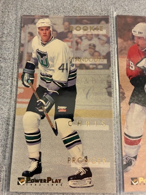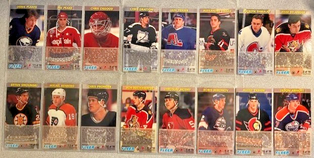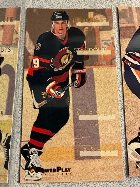 1993-94 Fleer Power Play Rookie Standouts - Complete 16-Card Tall Boys (Size: 2 1/2" x 4 11/16") Insert SET . All cards vary from Near Mint to Gem Mint in condition . Loaded with RCs, Stars and Superstars: Arnott, Pronger, Yashin, plus many more. Please see Checklist below for Player Names and card numbers. Please note that although the cards are in 6-pocket sleeve pages in the photos, the set will not be shipped with the pages. The cards in the photos are part of the set and represent a sample of what all the cards in this hand-collated set will look like. 1993-94 Fleer PowerPlay - Rising Stars Hockey 1 Arturs Irbe 2 Vyacheslav Kozlov 3 Felix Potvin 4 Keith Primeau 5 Robert Reichel 6 Geoff Sanderson 7 Martin Straka 8 Keith Tkachuk 9 Alexei Zhamnov 10 Sergei Zubov To date, we have left positive feedback for every single successful transaction since we started in 1999. Our main goal, though, is to get the items out ASAP into your hands. The time we spend on ensuring this, however, limits us into doing our Feedback only once or twice a month at which time we catch up on ALL of our feedback. So please be patient and do not e-mail us about leaving you feedback, you have our guarantee that it WILL eventually get done.