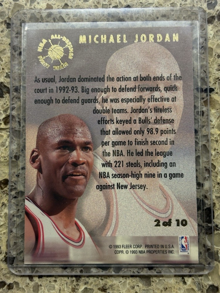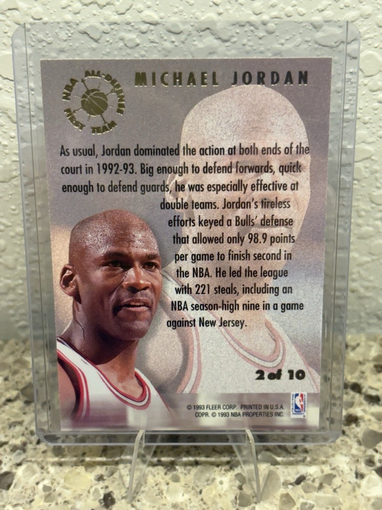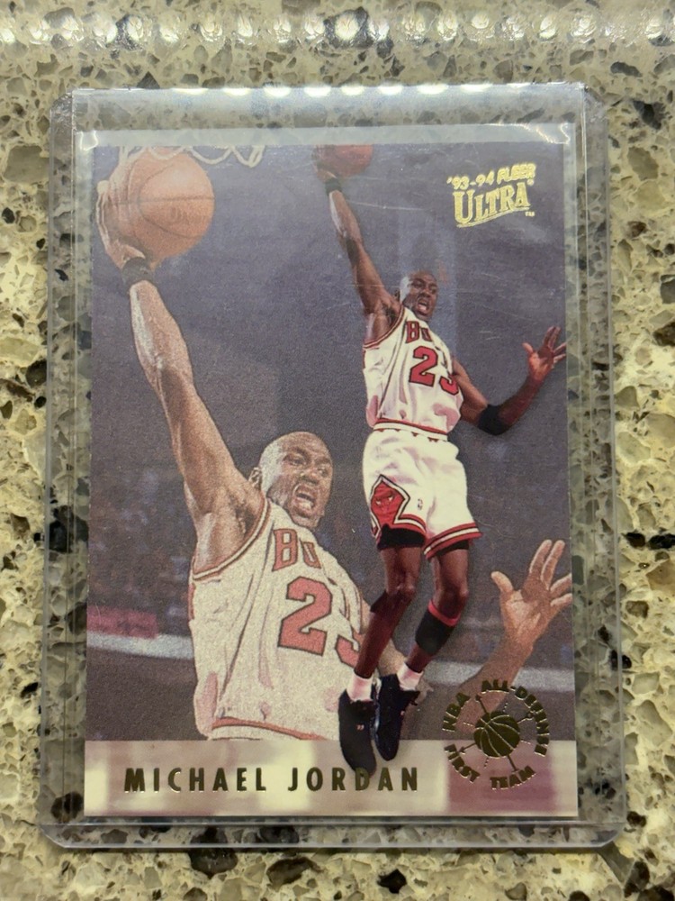 The product is a 1993-94 Fleer Ultra NBA All-Defense First Team trading card featuring Michael Jordan. This card is part of the NBA All-Defense First Team insert set and showcases the iconic basketball player. As a highly sought-after collectible, this sharp card is a valuable piece for fans and collectors of basketball trading cards, especially those interested in vintage and classic cards from the 1990s. Michael Jordan's association with this card further adds to its desirability and appeal to fans of the legendary player and the NBA. This card is in excellent or better condition. Clean and sharp looking card.