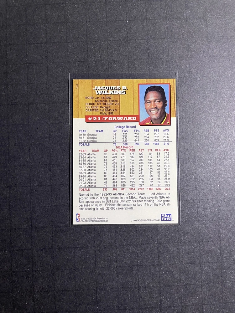 Manufacturer: SkyBox Player/Athlete: Dominique Wilkins Language: English League: National Basketball Association (NBA) Card Size: Standard Card Number: 7 Original/Licensed Reprint: Original Set: 1993-94 NBA Hoops Sport: Basketball Country/Region of Manufacture: United States Features: Base Set Type: Sports Trading Card Autograph Authentication: Score Season: 1993-94 Material: Card Stock Team: Atlanta Hawks, Boston Celtics, Brooklyn Nets, Charlotte Hornets, Dallas Mavericks, Denver Nuggets, Golden State Warriors, Houston Rockets, Los Angeles Clippers, Los Angeles Lakers, Memphis Grizzlies, Miami Heat, Milwaukee Bucks, Minnesota Timberwolves, New Jersey Nets, New Orleans Hornets, New York Knicks, Oklahoma City Thunder, Orlando Magic, Philadelphia 76ers, Phoenix Suns, Portland Trail Blazers, Sacramento Kings, San Antonio Spurs, Seattle Supersonics, Toronto Raptors, Utah Jazz, Washington Bullets, Washington Wizards Autographed: No