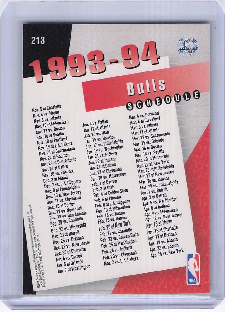 This is a nice example of a 1993-94 Upper Deck #213 Chicago Bulls Other important information about this card: In 1993 Chicago Bulls played for the Chicago Bulls. Please check out our other listings for more great cards.