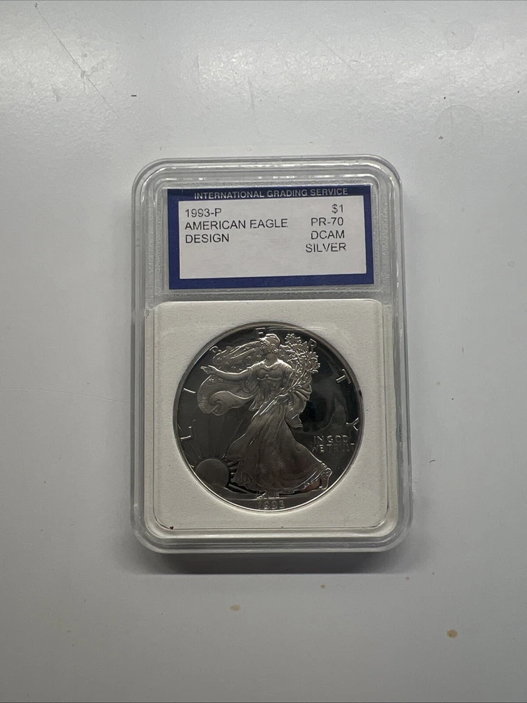 The product is a 1993-P American Silver Eagle $1 Gem Proof coin minted by the U.S. Mint in Philadelphia. It contains 1 oz of 0.999 silver and is of ungraded certification. The coin features a striking Proof strike type with a deep cameo (DCAM) finish, making it highly collectible. The design depicts the iconic American Eagle. This coin easily sells for hundreds of dollars.