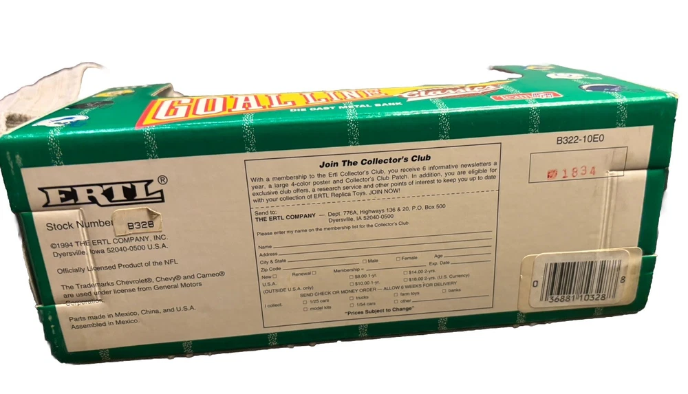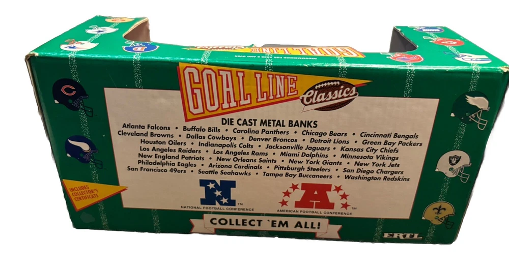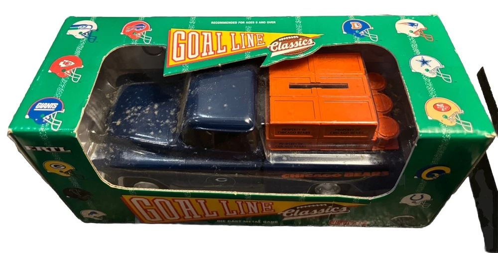 The 1994 Ertl Die Cast Metal Bank Goal Line Classics 55 Chevy Truck Chicago Bears is a vintage collectible toy featuring a Chevrolet delivery truck adorned with Chicago Bears NFL team branding. Made of metal, this 1994 model is part of the Team NFL series by Ertl. It serves as a bank and showcases a multi-color design typical of the era, making it a sought-after piece for enthusiasts of diecast vehicles and sports memorabilia.