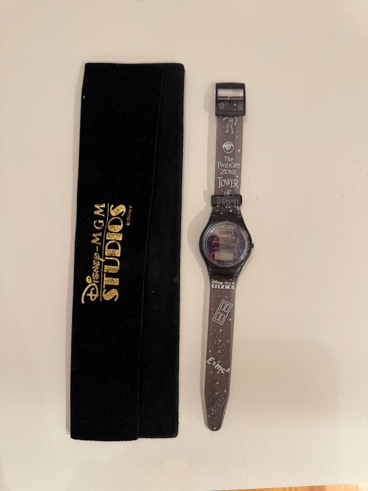 Rare limited edition Disney watch created for the Grand Opening of The Twilight Zone Tower of Terror at Disney-MGM Studios in July 1994 . This commemorative piece was part of the attraction’s opening merchandise and includes the original unused redemption voucher , watch sleeve, and the watch itself. 🕰️ What’s Included: Tower of Terror limited edition watch (1994) Original watch sleeve Unused voucher to redeem the watch 📦 Condition: Watch is unused and never worn Will require a new battery Packaging and voucher show light age but are well preserved (see photos) This is an exceptional find for Disneyana collectors, Tower of Terror fans, and vintage park memorabilia enthusiasts—especially with the unused voucher, which is rarely still included. A true piece of early Disney-MGM Studios history.