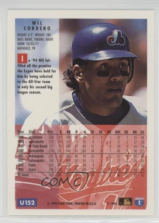 1994 Fleer Update - Box Set [Base] #U152 Wil Cordero - Baseball Card - Featuring the Montreal Expos - Featuring Wil Cordero Search for more: 1994 Fleer Update Search for more: 1994 Fleer Update - Box Set [Base] View all of our Listings Auctions Buy It Now About Us Located in the beautiful Pacific Northwest, COMC (Check Out My Cards) is the world's largest consignment service for trading card singles. More than 10,000 people have used our consignment service to list over 50 million trading cards. We currently house 20 million cards, each listed for sale with front and back images of the actual card. Find out how we can help you consign your items on eBay by contacting us through eBay messaging. COMC -- "The Safe & Easy Way to Buy & Sell" Representative Image - Select Specific Item above to see image of actual item Representative Image - Select Specific Item above to see image of actual item Raw Condition for Modern Cards Unless otherwise noted, raw modern cards are listed in Near Mint-Mint condition or better. A NM-MT card appears to be Mint at first glance, but upon closer inspection, may exhibit some of the following: minor print defects (e.g. roller marks, print line, dimple), minor scratches, slight edge wear, and slight corner wear. Centering is clearly visible in the images provided and does not factor into our condition assessment. Raw Condition for Vintage Cards Unless otherwise noted, raw vintage cards are listed in Excellent condition or better. An EX card may exhibit some of the following: minor rounding of corners, surface wear, print defects, light scratches, and slight edge wear/chipping. Centering is clearly visible in the images provided and does not factor into our condition assessment. Domestic Shipping Combined shipping for multiple items is available. To receive combined shipping, please ensure all desired items are in your eBay shopping cart before proceeding to checkout. eBay limits orders to 40 items per order. We automatically combine multiple orders placed on the same day. If you place multiple orders on the same day, please contact us to request a refund of applicable shipping costs. Signature confirmation may be required on invoices over $400. Raw cards are shipped in toploaders. International Shipping COMC offers eBay's International Shipping (EIS) for international orders under $2,500* (see country exceptions below). All duties and import fees are paid at checkout; in the rare event that there are additional import fees upon delivery, these are borne by the buyer. EIS packages route through a shipping hub in Erlanger, KY before shipping to their final destination. Please note that EIS does not allow for combined shipments. The shipping rates are determined by eBay and cannot be adjusted. *Maximum sale price exceptions: Colombia, Kuwait ($2,000); Taiwan ($1,539); Chile, Costa Rica, Guatemala, Honduras, Trinidad and Tobago ($1,000); Antigua and Barbuda, Aruba, Belize, Dominica, Grenada, Philippines, Saint Kitts and Nevis, Saint Lucia, Montserrat, Turks and Caicos Islands ($500); Dominican Republic, El Salvador ($200). Please request a shipping quote through eBay messaging for orders that exceed the maximum sale price supported by eBay's International Shipping. You will be responsible for all duties and import fees for international orders shipped outside the EIS. Raw cards are shipped in toploaders. Payment COMC does not accept offers on our cards through our eBay storefront. COMC utilizes eBay’s managed payments system. If you are experiencing difficulties making a payment, please contact eBay for assistance. Return Policy Returns are only accepted on the rare occasion the item is not as described. If you are making a return, please initiate the return process through eBay so a mailing label can be provided for you. Prior to listing, our expert team carefully assessed this item to represent it accurately. Please review the description and high-definition images prior to purchasing to ensure this item meets your satisfaction. We welcome you to contact us if you have further questions about this item. Trust and Integrity COMC carefully assesses each item consigned to us to prevent fraudulent items from entering the marketplace. If you believe an item offered on COMC may be fraudulent, please contact us with details so we can investigate the issue. Items we determine are outside our supported items policy may be removed. Last Modified: 1/2/2025 8:01:59 AM PDT