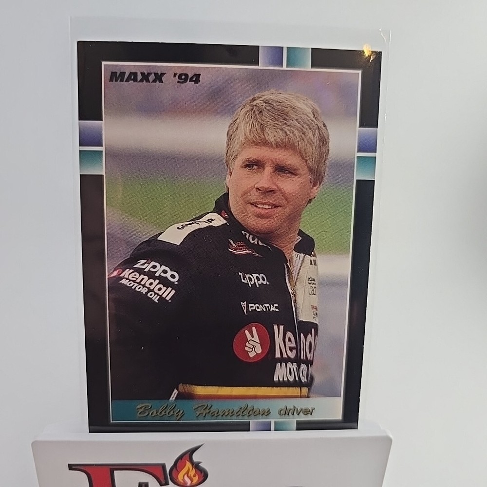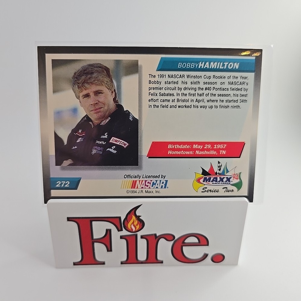 This is a 1994 Maxx trading card featuring NASCAR driver Bobby Hamilton, card number 272. It is a standard-sized sports trading card from the base set of the 1994 Maxx series, manufactured by J.R. Maxx Inc. The card is an original licensed print and is not autographed. It is part of the sport of auto racing and is not considered vintage. Thank you for your interest, don't let it get away bid today!