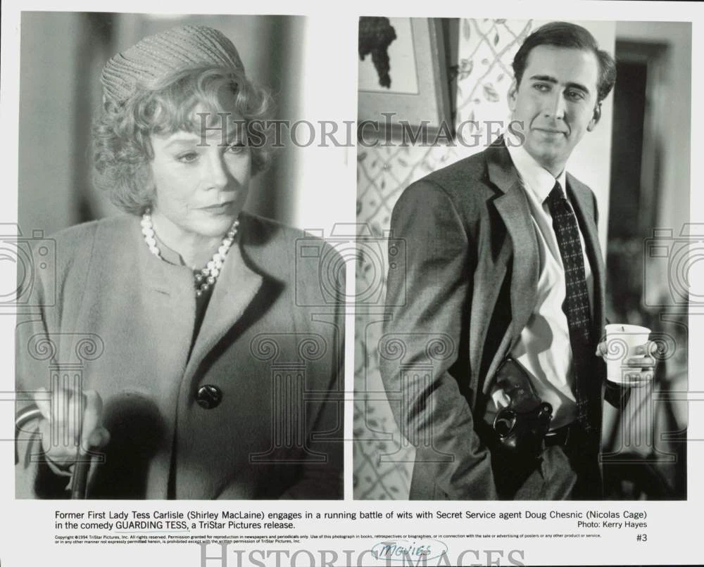 ebay template Note: Please study the images carefully to determine the condition of this vintage photograph, as it may not be in perfect condition. It may contain wrinkles, cracks, and possibly even tears due to its age and how it was handled before it got to us. A scanner may interpret colors and contrast differently than human eyes will, so it is possible that the actual photograph may be slightly darker or lighter in person. This vintage photograph is offered for sale as a collectible item and conveys no transfer of copyright. 1994 Press Photo Shirley MacLaine, Nicolas Cage star in the film "Guarding Tess" Former First Lady Tess Carlisle (Shirley MacLaine) engages in a running battle of wits with Secret Service agent Doug Chesnic (Nicolas Cage) in the comedy "Guarding Tess," a TriStar Pictures release. --- Movies Photo measures 10 x 8 inches. Photo Is dated 1994. PHOTO FRONT PHOTO BACK Historic Images Part Number: afx29653 Sell Smarter with Kyozou. Inventory and Ecommerce Management