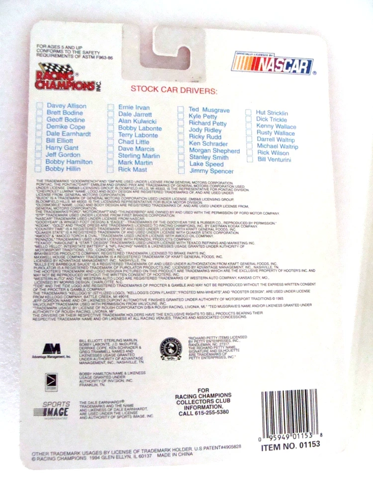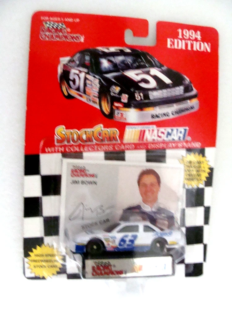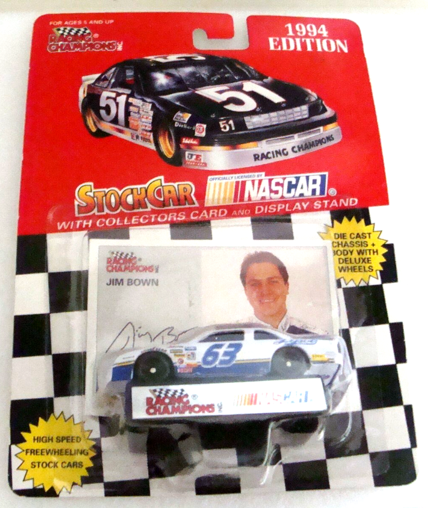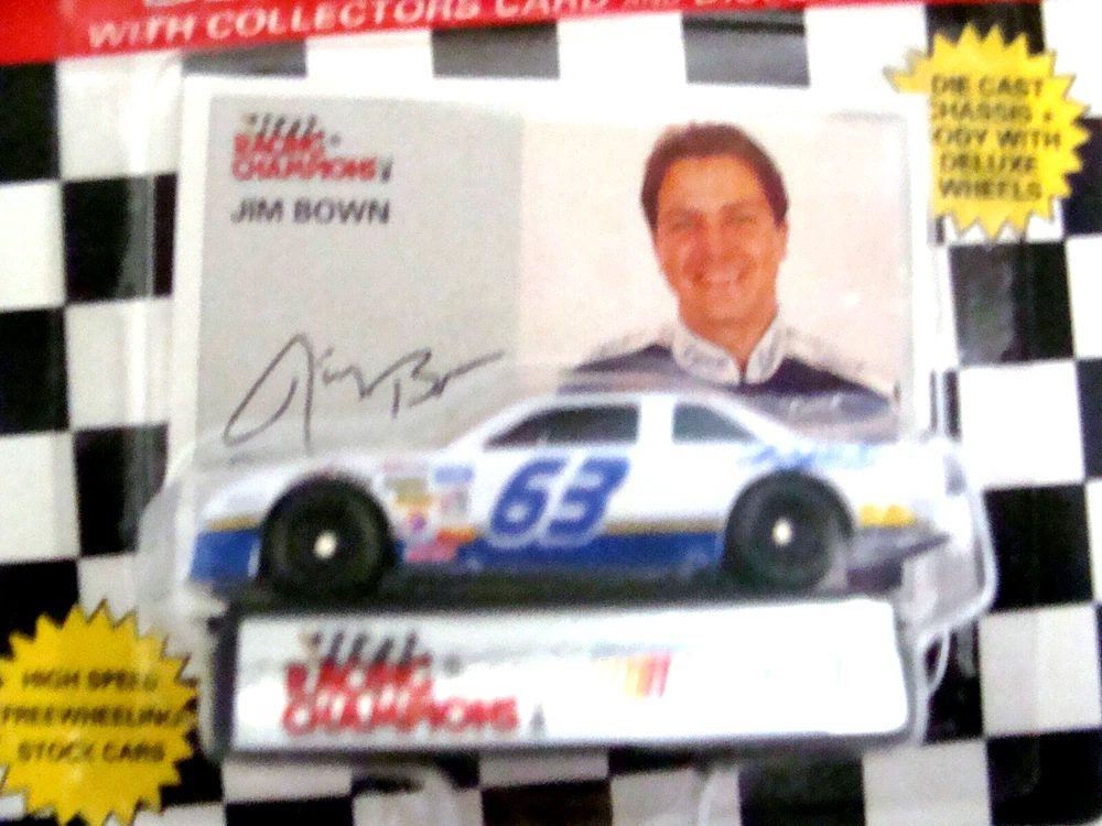 1994 Racing Champions 1:64 Nascar diecast car in new condition on the never opened original blister card. Pkg in very good condition. Bubble is clear, clean and dent free. NICE !!! Please VIEW all Photos. Dark Windows. The 1:64 scale #63 Jim Bown Lysol race car is white in color with blue trimmings. Jim Bown name above door windows. Blue #63 on roof top and door panels. LYSOL name scripted across hood, uppr rear qtr, trunk deck. Pugh Oil Co is lettered on rear panel. Goody's, Moog, Prestone, 76, Simpson, Die Hard, GoodYear are some of the contingency logos on car. Great tires with Goodyear lettering. Card of driver Jim Bown also included. Winner to pay $6.55 S/H USPS GA w/tracking. EBMP accepted. Thanks for looking & great luck with your bid.....Combo shipping will be $1.00 each for additional 1:64 or 1:87 cars. Please contact me for invoice if the cart option does not work.