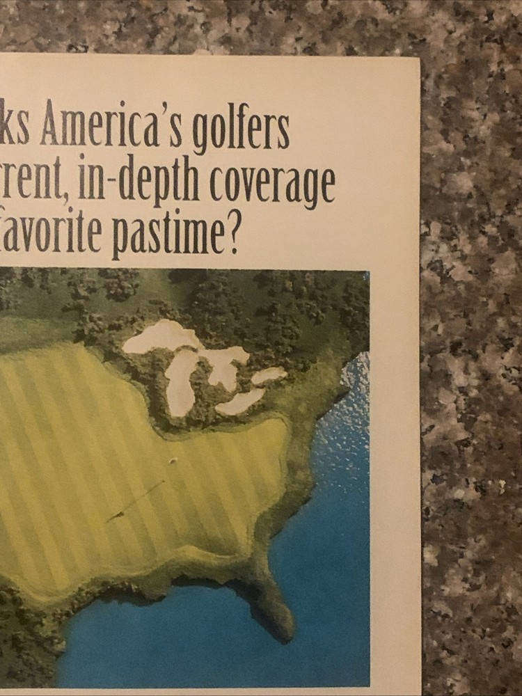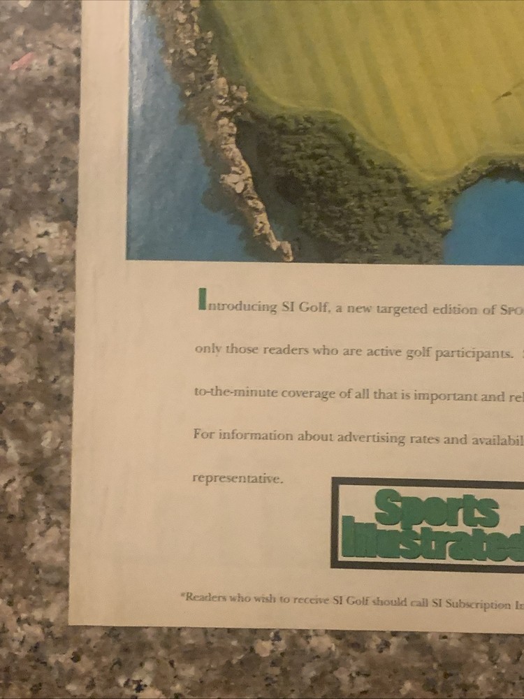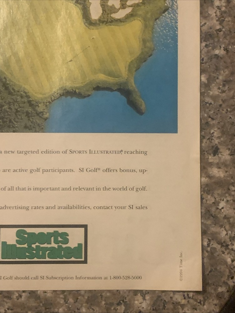 The product is a vintage 1994 Sports Illustrated magazine print ad featuring an aerial view of a golf green shaped like the USA map. The ad is colorful and measures approximately 8"x11". It is related to SI Golf and was created in the United States in the 1990s.