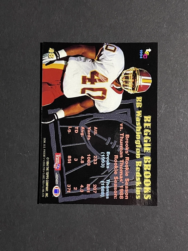 League: National Football League (NFL) Season: 1994 Language: English Country/Region of Manufacture: United States Set: 1994 Topps Stadium Club (Football) Parallel/Variety: Members Only Card Number: 48 Autographed: No Features: Insert Player/Athlete: Reggie Brooks Material: Card Stock Card Size: Standard Type: Sports Trading Card Sport: Football Manufacturer: Topps Original/Licensed Reprint: Original Team: Miami Dolphins, Buffalo Bills, New York Jets, Denver Broncos, New England Patriots, Kansas City Chiefs, Oakland Raiders, San Diego Chargers, Indianapolis Colts, Jacksonville Jaguars, Cincinnati Bengals, Pittsburgh Steelers, Cleveland Browns, Dallas Cowboys, New York Giants, Philadelphia Eagles, Washington Commanders, Tampa Bay Buccaneers, Atlanta Falcons, Carolina Panthers, San Francisco 49ers, Seattle Seahawks, Arizona Cardinals, Los Angeles Rams, Green Bay Packers, Detroit Lions, Minnesota Vikings, Chicago Bears