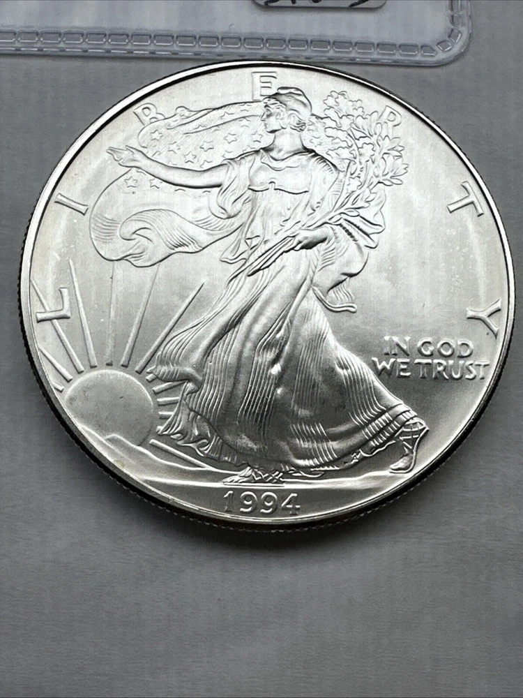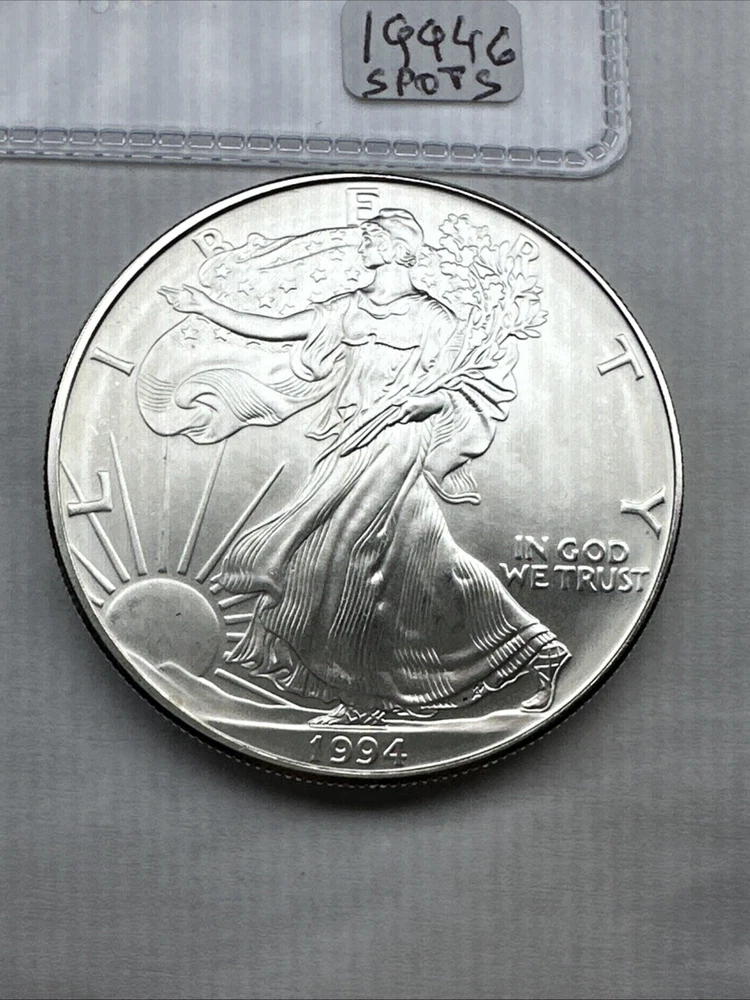 This is a 1994 1 oz American Silver Eagle coin minted by the U.S. Mint. It has a fineness of 0.999 fine silver and is uncirculated, with some spots. This key date coin features the iconic American Eagle design and contains a total of 1 oz of silver content.