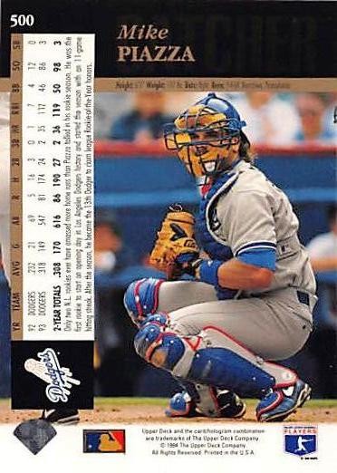This is a nice example of a 1994 Upper Deck #500 Mike Piazza Other important information about this card: In 1994 Mike Piazza played for the Los Angeles Dodgers. Please check out our other listings for more great cards.