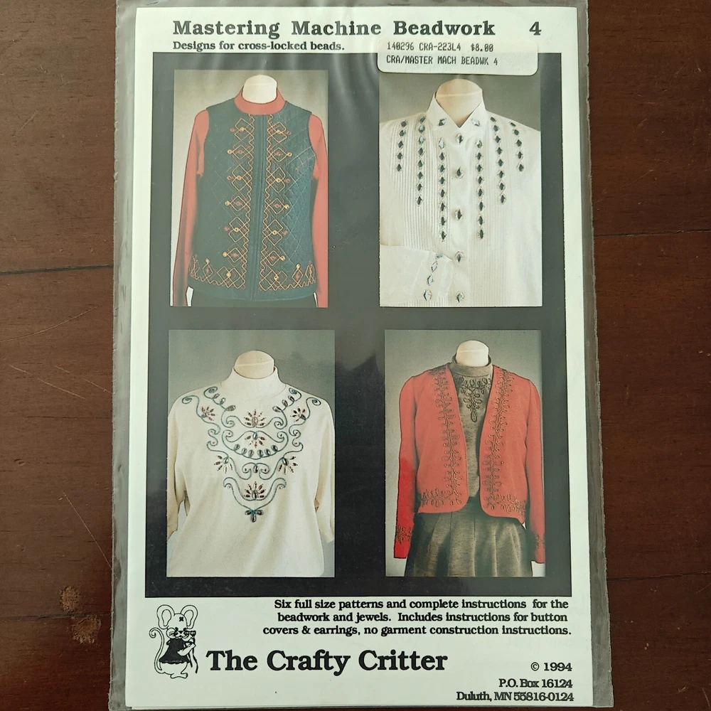 Description: This 1994 vintage "Mastering Machine Beadwork" pattern set by The Crafty Critter offers six full-size patterns and instructions for intricate beadwork and jewelry embellishments. Designs include stunning shirts, jackets, vests, and accessories such as button covers and earrings. Brand: The Crafty Critter Year: 1994 Condition: New old stock (factory-sealed, minor wear on plastic wrap) Designs Included: Large & Small Diamond Tuxedo Shirts, Ecru Shirt, Scrollwork Suit (Red Jacket & Gunmetal Blouse), Denim Vest, Button Covers, and Earrings Materials Needed: Cross-locked beads, jewels, and embroidery thread (not included) This set is ideal for anyone looking to add detailed beadwork to their garments or create unique, vintage-inspired embellishments. Instructions are tailored for crafting with high-quality materials like cross-locked beads and gems. Keywords: vintage crafting patterns, machine beadwork, 1992 The Crafty Critter, Ultra Suede appliquΓ©, sequin embellishment, crafting supplies, vintage sewing patterns