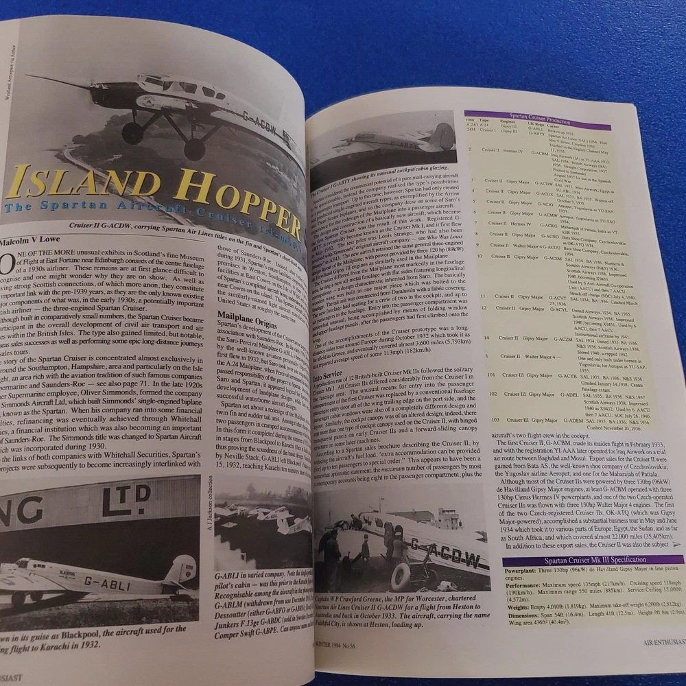 Signed: No Features: Illustrated Publication Name: 1994 WINTER NO. 56 - AIR ENTHUSIAST Language: English Country/Region of Manufacture: United Kingdom Contributors: Unknown Distribution: Paid Circulation Topic: Aircraft Publication Month: January, December Publication Year: 1994 Publisher: AIR ENTHUSIAST Volume: Unknown Genre: Activity, Airplanes Subscription: No Publication Frequency: Quarterly Issue Number: 56