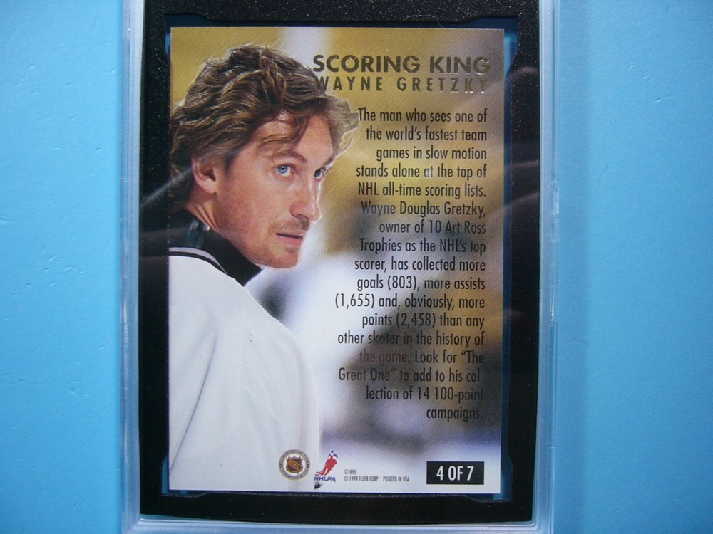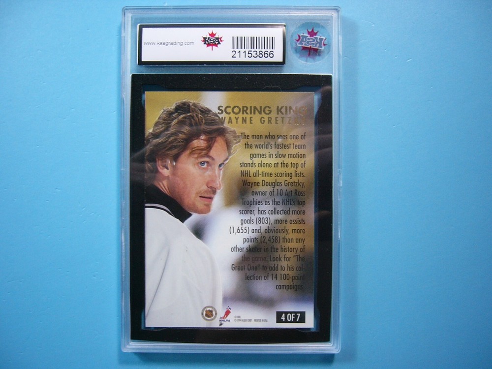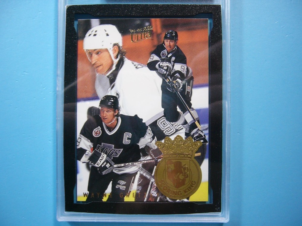 YOU ARE BIDDING ON A 1993/94 FLEER ULTRA NHL HOCKEY CARD #4 WAYNE GRETZKY, LOS ANGELES KINGS. SCORING KING CARD IS GRADED 10 BY KSA IN GEM MINT CONDITION. GREAT COLOUR & GLOSS--A SUPER SHARP, CLEAN & ATTRACTIVE KEY CARD FROM THIS VERY ATTRACTIVE VINTAGE NHL HOCKEY SET!!! THANK YOU FOR LOOKING AND GOOD LUCK!!! -------------------------------------------------------------------------------------------------------------------------------- SHIPPING WITHIN CANADA IS $4.99. SHIPPING TO THE UNITED STATES IS $8.99 AND INCLUDES TRACKING & INSURANCE. SHIPPING INTERNATIONALLY (ANYWHERE ELSE) IS $25.00 AND INCLUDES TRACKING & INSURANCE. ITEM WILL BE CAREFULLY PACKAGED SO AS NOT TO GET DAMAGED DURING SHIPPING. IF YOU ARE IN CANADA AND WOULD LIKE SHIPPING WITH TRACKING & INSURANCE INCLUDED COST IS $12.99. PLEASE CONTACT US BEFORE PAYMENT IS MADE TO ADJUST THE INVOICE ACCORDINGLY. WE DO COMBINE SHIPPING ON MULTIPLE PURCHASES--ONLY $1.00 MORE FOR EACH ADDITIONAL SINGLE GRADED CARD OR ONLY 25 CENTS MORE FOR EACH ADDITIONAL SINGLE UNGRADED CARD. TAKE A LOOK AT OUR OTHER AUCTIONS AND SAVE ON SHIPPING!!!