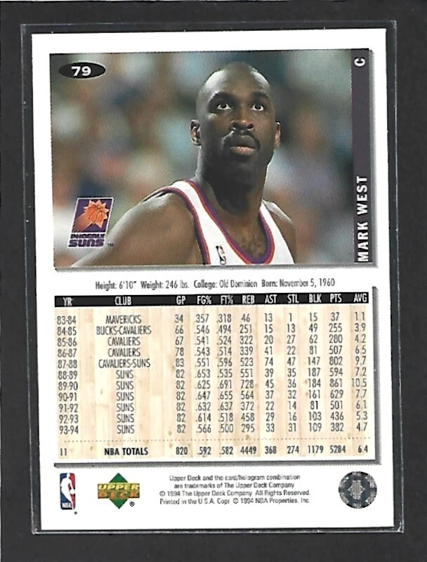 brand: Upper Deck Season: 1994-95 League: National Basketball Association (NBA) Series: Upper Deck Collector's Choice Set: 1994-95 Upper Deck Collector's Choice Player/Athlete: Mark West Sport: Basketball Team: Phoenix Suns Manufacturer: Upper Deck Card Number: 79 Parallel/Variety: Silver Foil Signature Features: Parallel/Variety, Base Set