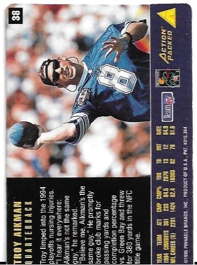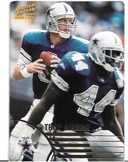 Elevate your football memorabilia collection with the 1995 Action Packed Rookies & Stars #38 card featuring the iconic Troy Aikman. As a highlight of the set, this card captures a piece of sports history with the legendary Dallas Cowboys quarterback, making it an essential for fans and collectors alike. Crafted by Pinnacle, this base set card is a testament to Aikman's storied NFL career and an emblem of 1995 football. Whether you're looking to commemorate the era or cherish the legacy of a football great, this card is a valuable addition to any collection.