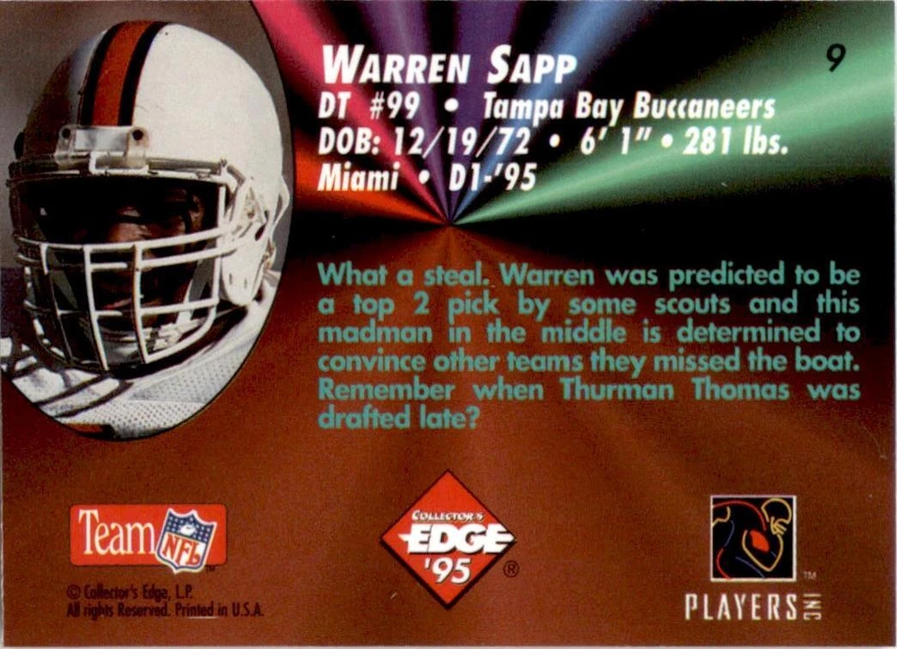 1995 Collector's Edge Rookies Black Label #9 Warren Sapp Tampa Bay Buccaneers Condition: NM-MT