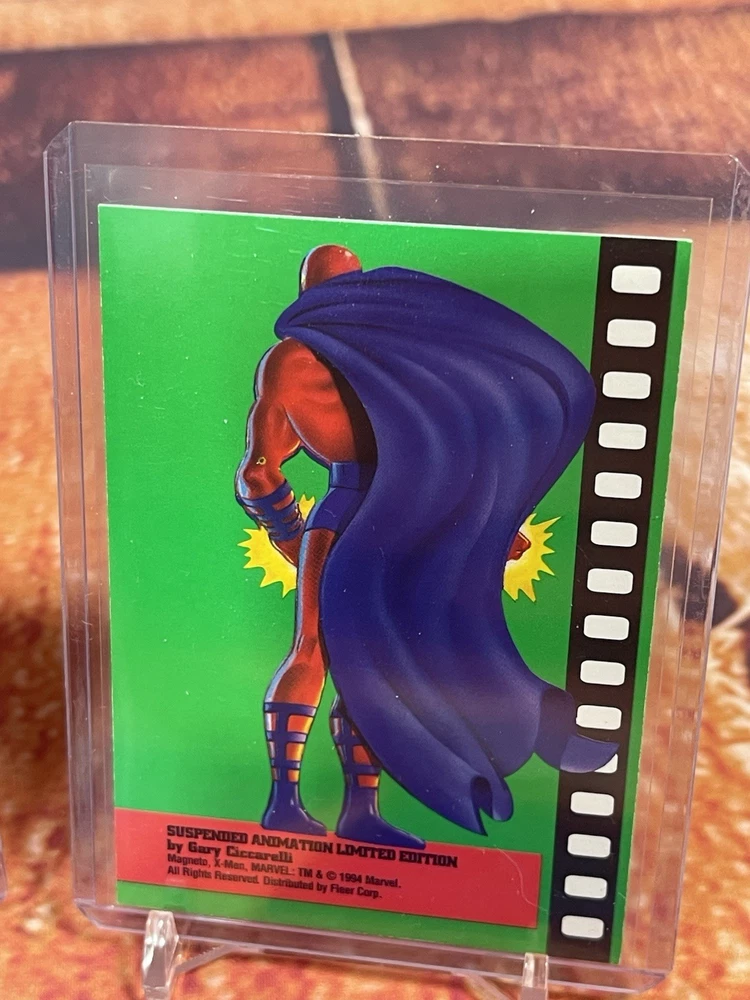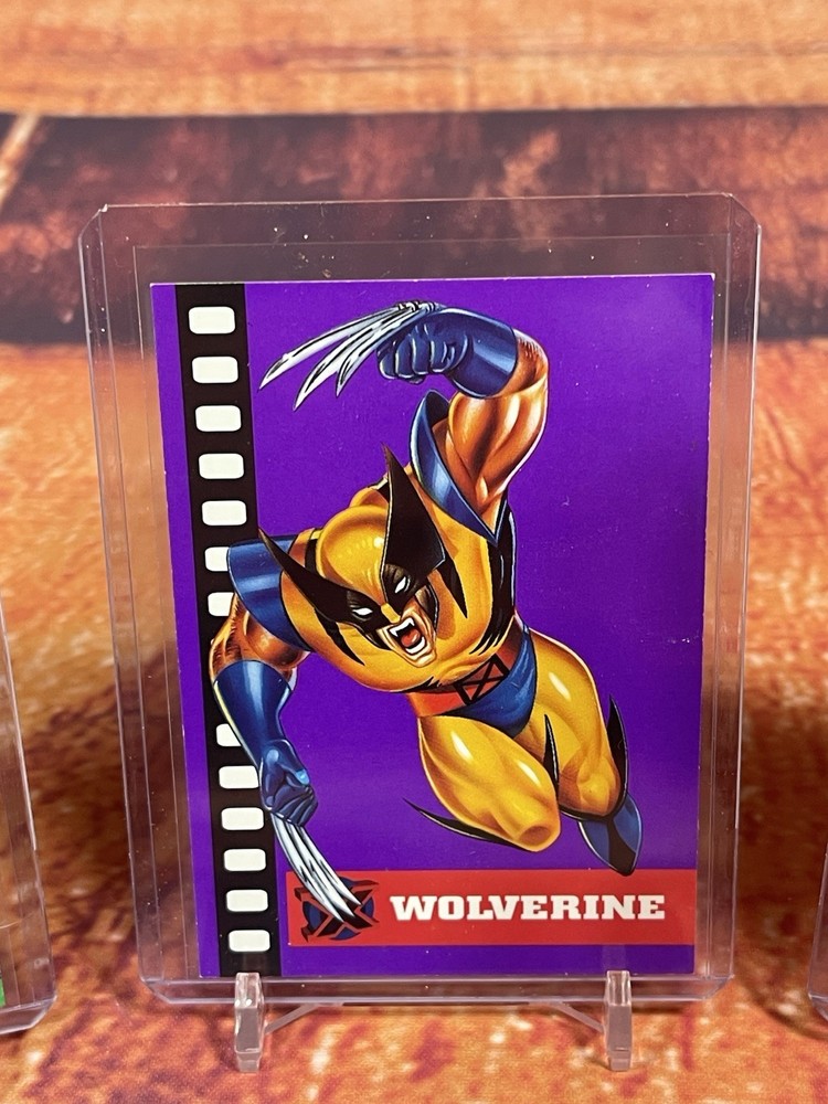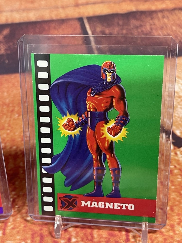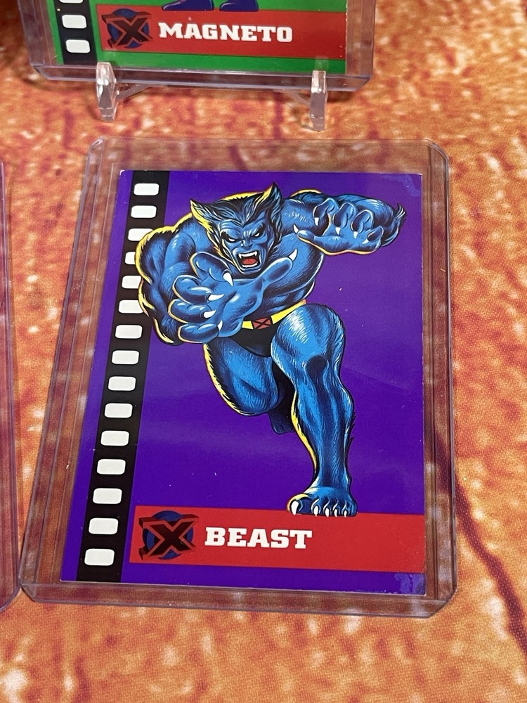 Damage on front bottom right corner of cyclops as seen in pick. Very rare to see complete set of all 6 cards! The complete 1995 Fleer Ultra X-Men Suspended Animation Toy Biz promo set consists of 6 specific cards featuring popular X-Men characters. These promo cards were inserts with solid-color backgrounds, different from the standard 10-card acetate insert set found in hobby packs. Toy Biz Promo Set Checklist The 1995 Fleer Ultra X-Men Toy Biz promo cards were included inside carded action figures from the Toy Biz X-Men Classics line and are printed on regular card stock with a 1994 copyright and a stylized "X" logo. The complete set includes the following 6 characters: Beast: Featured in the promo set. Cyclops: Available as a promo card. Gambit: Part of this specific 6-card set. Magneto: Also included in the set. Storm: A character featured in the Toy Biz promo. Wolverine: The final card, often considered the most popular and potentially valuable of the set. Distinction from Standard Insert Set