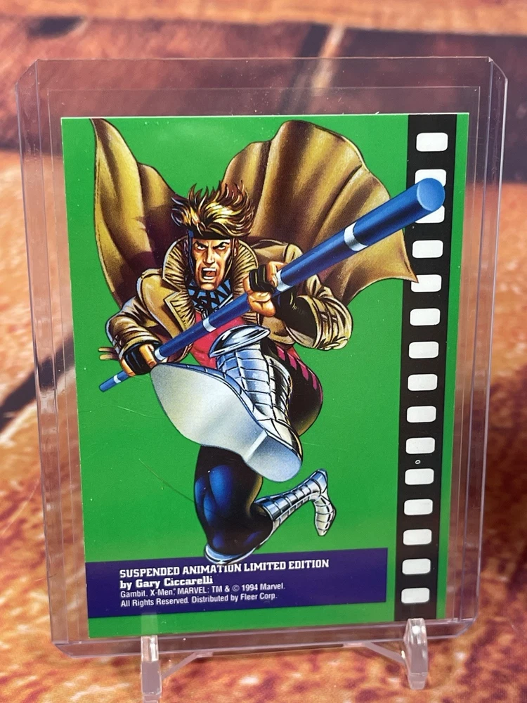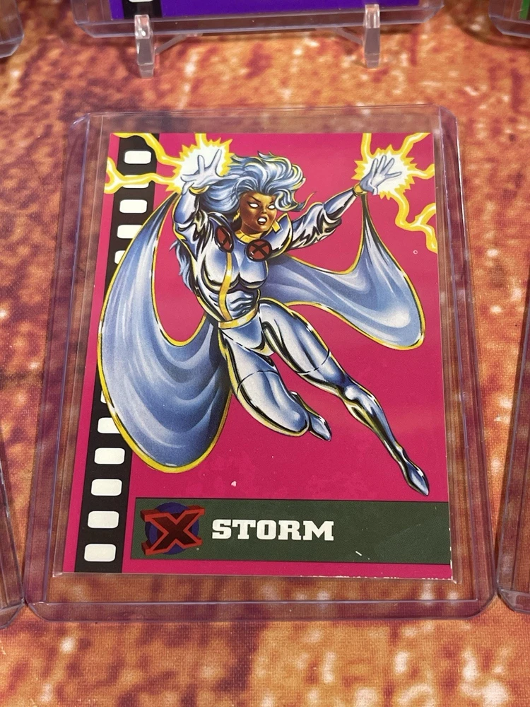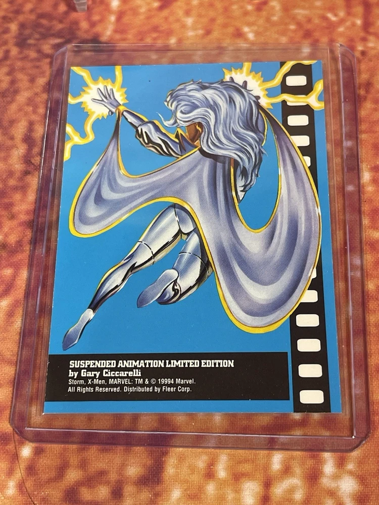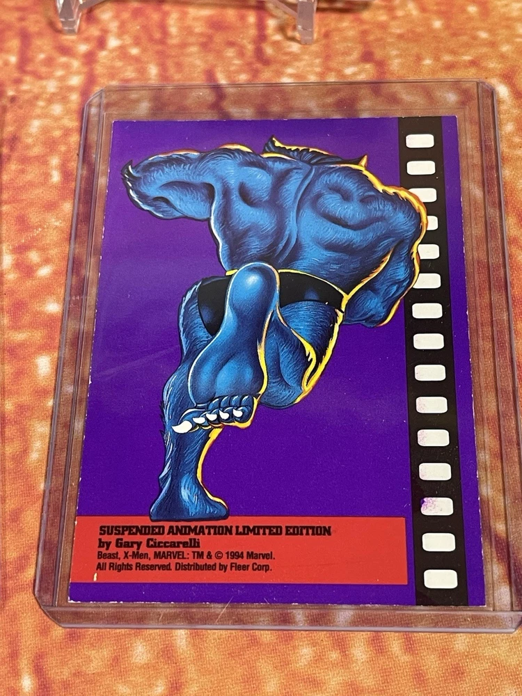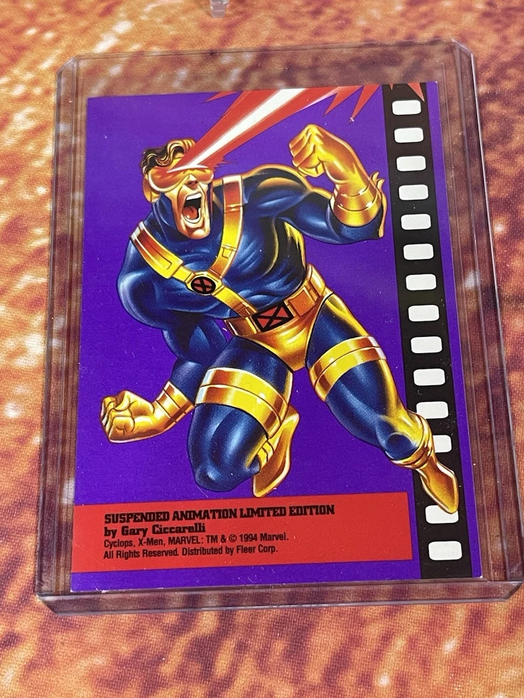 Damage on front bottom right corner of cyclops as seen in pick. Very rare to see complete set of all 6 cards! The complete 1995 Fleer Ultra X-Men Suspended Animation Toy Biz promo set consists of 6 specific cards featuring popular X-Men characters. These promo cards were inserts with solid-color backgrounds, different from the standard 10-card acetate insert set found in hobby packs. Toy Biz Promo Set Checklist The 1995 Fleer Ultra X-Men Toy Biz promo cards were included inside carded action figures from the Toy Biz X-Men Classics line and are printed on regular card stock with a 1994 copyright and a stylized "X" logo. The complete set includes the following 6 characters: Beast: Featured in the promo set. Cyclops: Available as a promo card. Gambit: Part of this specific 6-card set. Magneto: Also included in the set. Storm: A character featured in the Toy Biz promo. Wolverine: The final card, often considered the most popular and potentially valuable of the set. Distinction from Standard Insert Set