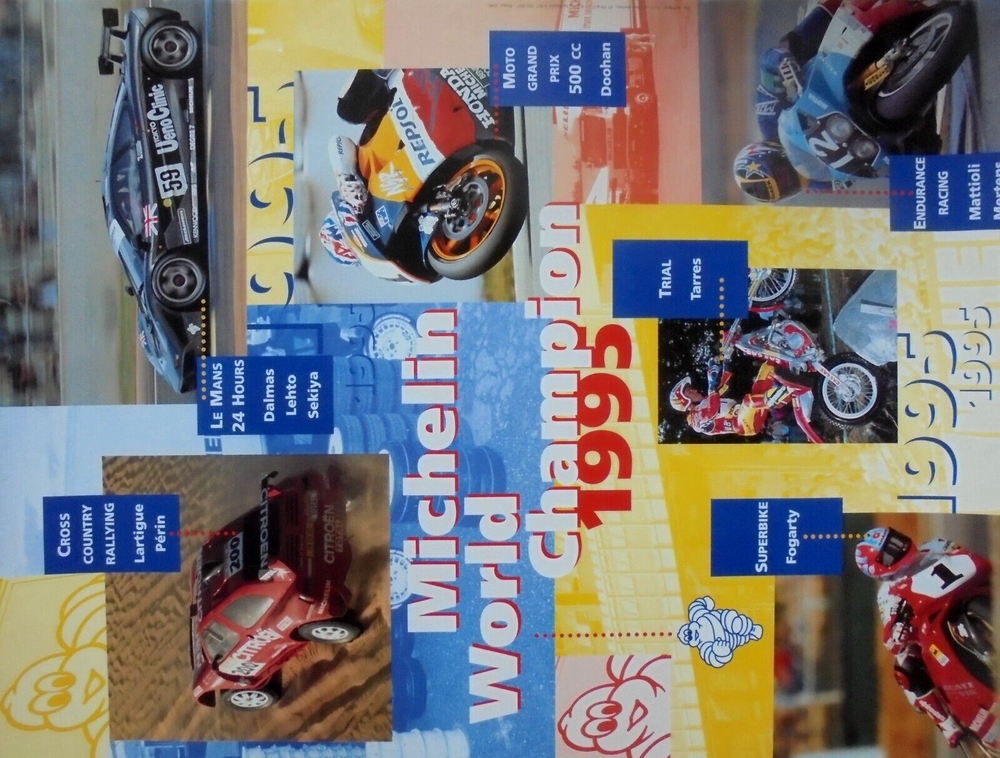 Lovely original poster featuring the Michelin Champions of 1995. This poster is in excellent condition and measures 80cm x 60cm, printed in France "Communication Michelin". It includes Le Mans 24 Hours Lehto, Cross Country Rallying Citroen, Moto GP 500cc Doohan, Superbike Fogarty, Endurance Trial Bikes. Only one for sale. View my other posters and combine postage, buy any quantity of posters for one delivery charge .