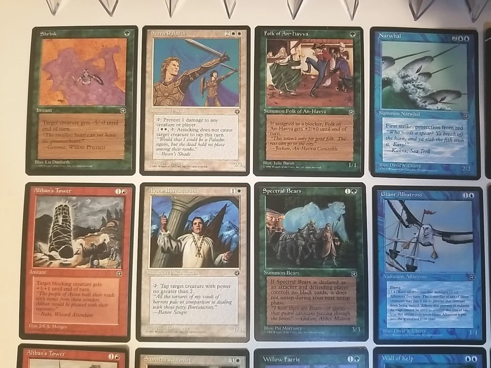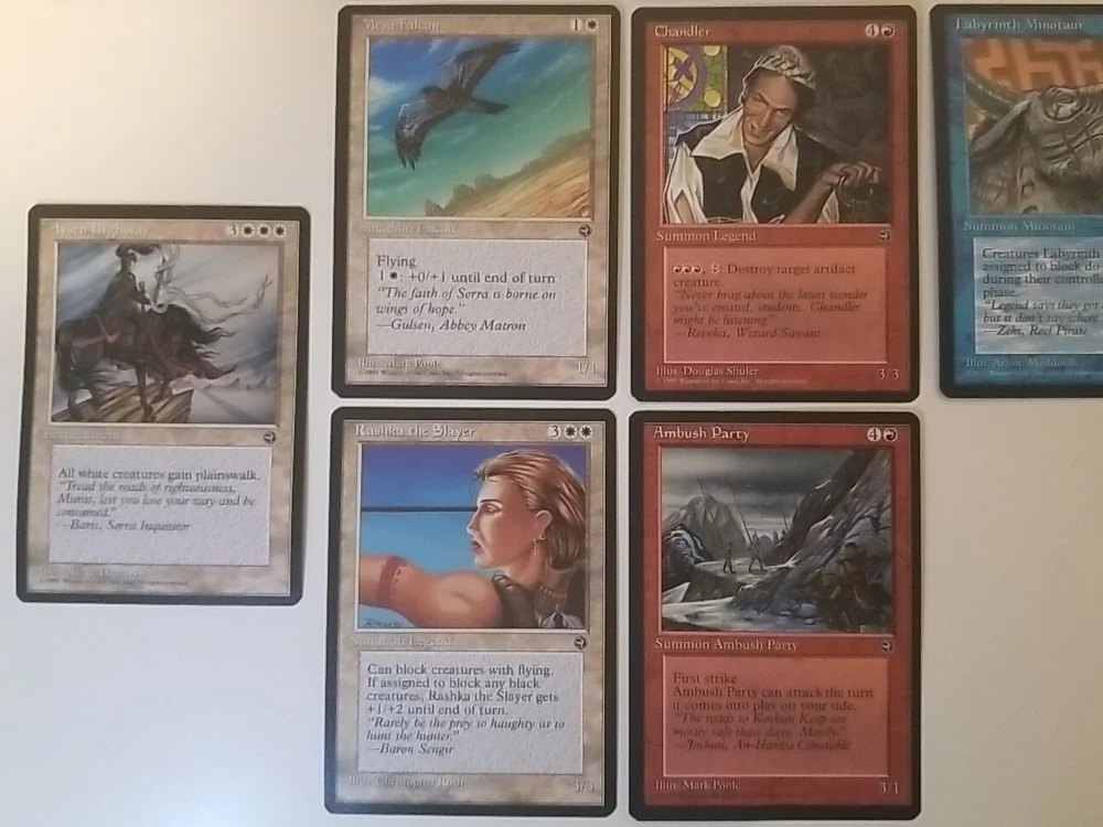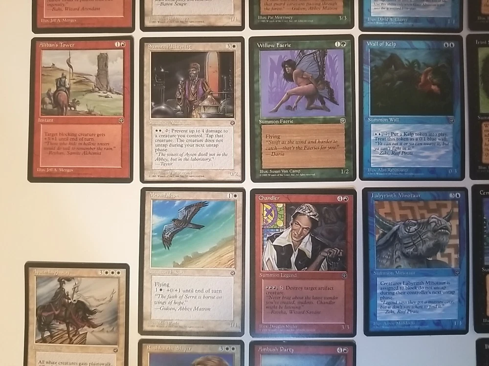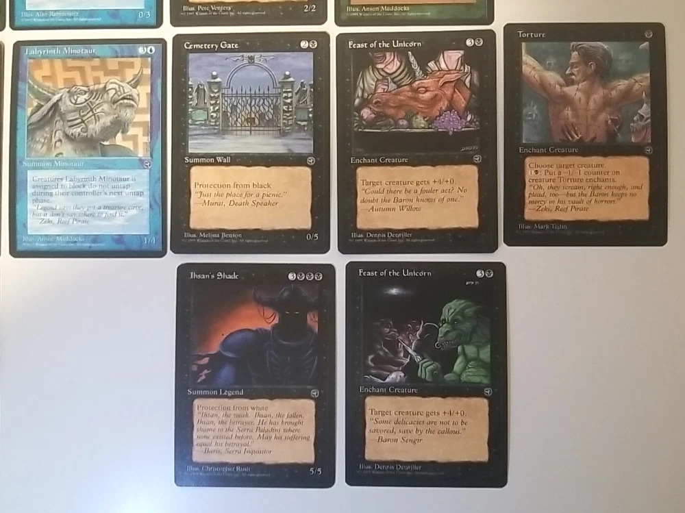 Card lot will be securely placed in a team bag and shipped in a bubble envelope. Cards are lightly played except one shown in the photos. This lot of 34 vintage Magic the Gathering trading cards from the Homelands set is a must-have for any collector. With cards in red, white, blue, black, and green, this set covers the full range of colors and includes all types of cards such as instant, summon, enchantment creature, enchantment, and artifact creature. The cards are lightly played (excellent) and made of high-quality card stock material. These cards were manufactured by Wizards of the Coast in the United States in 1995 and are in regular finish. They are perfect for Magic: The Gathering enthusiasts and collectors alike. The set comes in a standard size and is in English language. Don't miss the chance to add this rare collection to your MTG card collection.