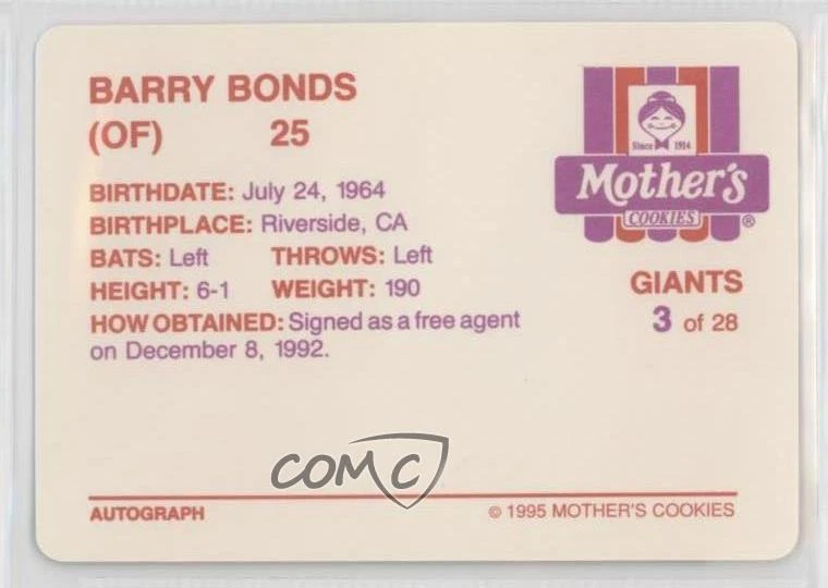 1995 Mother's Cookies San Francisco Giants - Stadium Giveaway [Base] #3 Barry Bonds - Baseball Card - Featuring the San Francisco Giants - Featuring Barry Bonds Search for more: 1995 Mother's Cookies San Francisco Giants Search for more: 1995 Mother's Cookies San Francisco Giants - Stadium Giveaway [Base] View all of our Listings Auctions Buy It Now About Us Located in the beautiful Pacific Northwest, COMC (Check Out My Cards) is the world's largest consignment service for trading card singles. More than 10,000 people have used our consignment service to list over 50 million trading cards. We currently house 20 million cards, each listed for sale with front and back images of the actual card. Find out how we can help you consign your items on eBay by contacting us through eBay messaging. COMC -- "The Safe & Easy Way to Buy & Sell" Representative Image - Select Specific Item above to see image of actual item Representative Image - Select Specific Item above to see image of actual item Raw Condition for Modern Cards Unless otherwise noted, raw modern cards are listed in Near Mint-Mint condition or better. A NM-MT card appears to be Mint at first glance, but upon closer inspection, may exhibit some of the following: minor print defects (e.g. roller marks, print line, dimple), minor scratches, slight edge wear, and slight corner wear. Centering is clearly visible in the images provided and does not factor into our condition assessment. Raw Condition for Vintage Cards Unless otherwise noted, raw vintage cards are listed in Excellent condition or better. An EX card may exhibit some of the following: minor rounding of corners, surface wear, print defects, light scratches, and slight edge wear/chipping. Centering is clearly visible in the images provided and does not factor into our condition assessment. Domestic Shipping Combined shipping for multiple items is available. To receive combined shipping, please ensure all desired items are in your eBay shopping cart before proceeding to checkout. eBay limits orders to 40 items per order. We automatically combine multiple orders placed on the same day. If you place multiple orders on the same day, please contact us to request a refund of applicable shipping costs. Signature confirmation may be required on invoices over $400. Raw cards are shipped in toploaders. International Shipping COMC offers eBay's International Shipping (EIS) for international orders under $2,500* (see country exceptions below). All duties and import fees are paid at checkout; in the rare event that there are additional import fees upon delivery, these are borne by the buyer. EIS packages route through a shipping hub in Erlanger, KY before shipping to their final destination. Please note that EIS does not allow for combined shipments. The shipping rates are determined by eBay and cannot be adjusted. *Maximum sale price exceptions: Colombia, Kuwait ($2,000); Taiwan ($1,539); Chile, Costa Rica, Guatemala, Honduras, Trinidad and Tobago ($1,000); Antigua and Barbuda, Aruba, Belize, Dominica, Grenada, Philippines, Saint Kitts and Nevis, Saint Lucia, Montserrat, Turks and Caicos Islands ($500); Dominican Republic, El Salvador ($200). Please request a shipping quote through eBay messaging for orders that exceed the maximum sale price supported by eBay's International Shipping. You will be responsible for all duties and import fees for international orders shipped outside the EIS. Raw cards are shipped in toploaders. Payment COMC does not accept offers on our cards through our eBay storefront. COMC utilizes eBay’s managed payments system. If you are experiencing difficulties making a payment, please contact eBay for assistance. Return Policy Returns are only accepted on the rare occasion the item is not as described. If you are making a return, please initiate the return process through eBay so a mailing label can be provided for you. Prior to listing, our expert team carefully assessed this item to represent it accurately. Please review the description and high-definition images prior to purchasing to ensure this item meets your satisfaction. We welcome you to contact us if you have further questions about this item. Trust and Integrity COMC carefully assesses each item consigned to us to prevent fraudulent items from entering the marketplace. If you believe an item offered on COMC may be fraudulent, please contact us with details so we can investigate the issue. Items we determine are outside our supported items policy may be removed. Last Modified: 1/2/2025 1:54:13 PM PDT