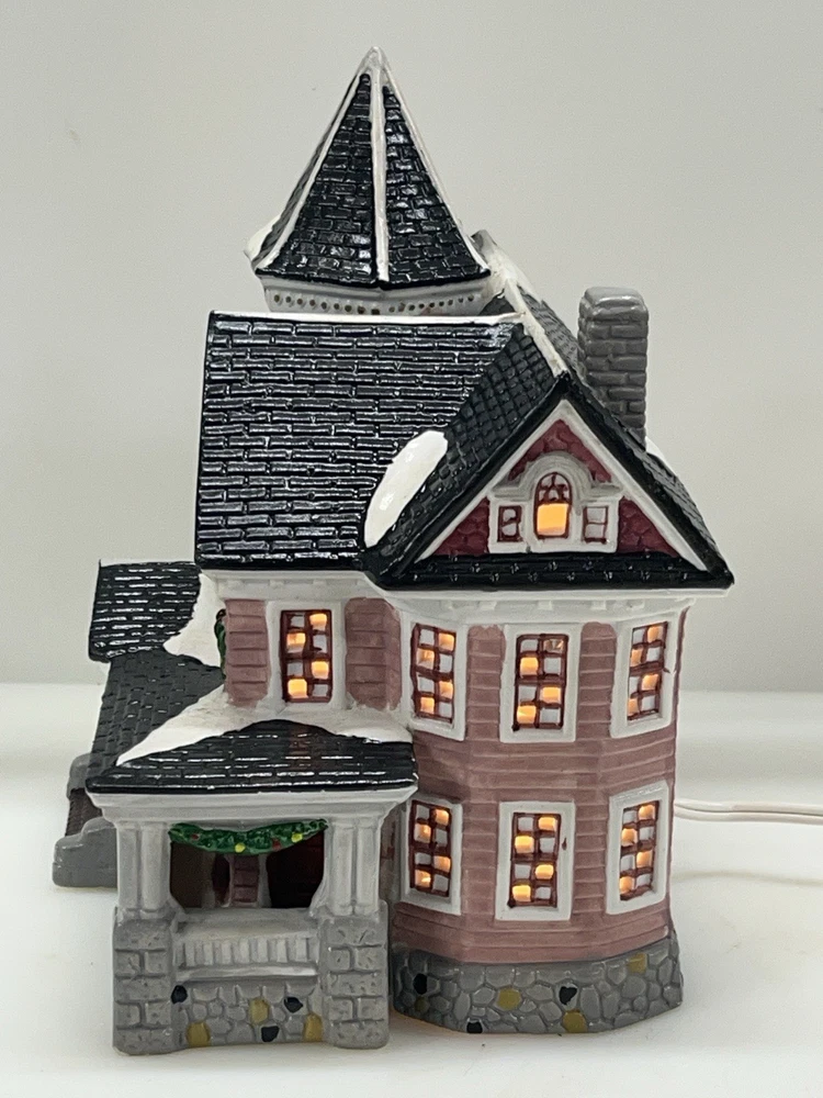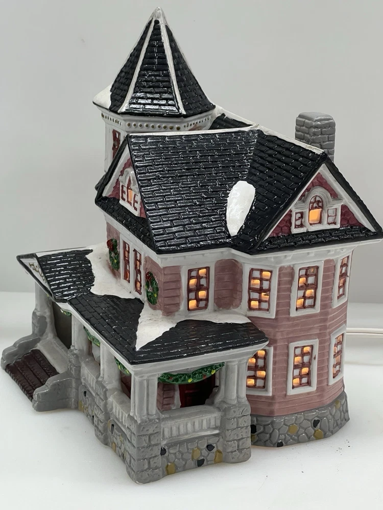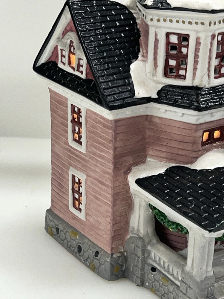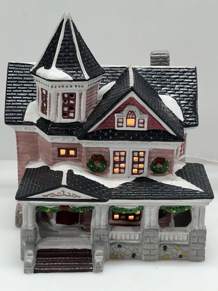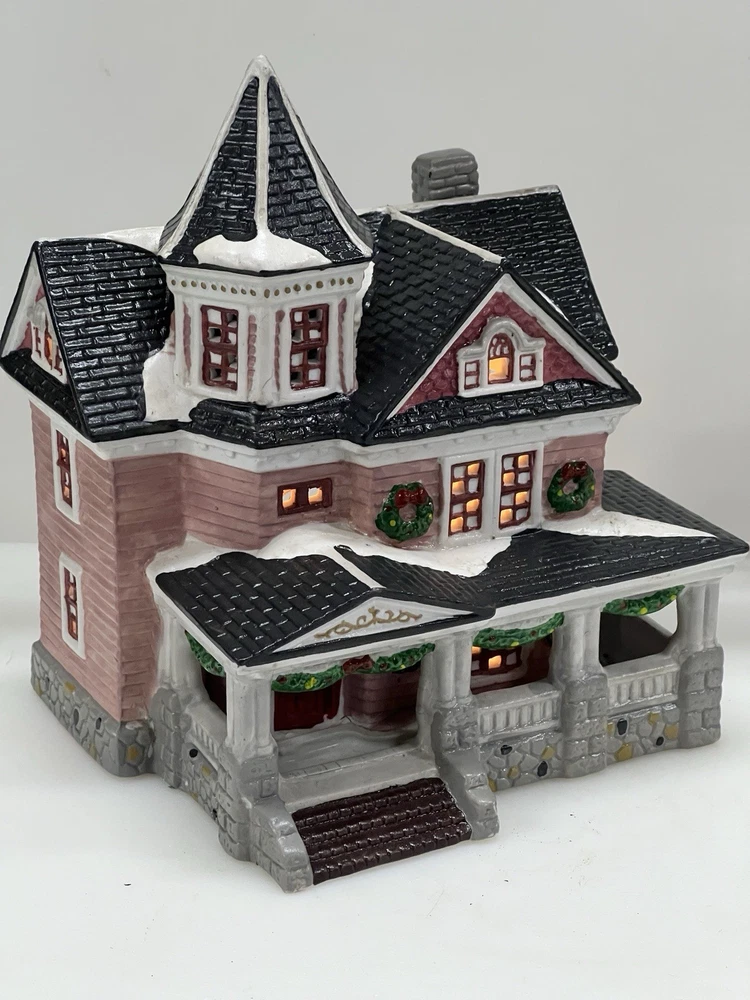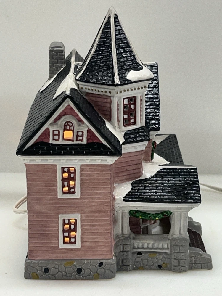 This beautiful piece from Dickens Collectables Victorian Series is a medium-sized, asymmetrical-shaped, multicolored porcelain Christmas Village house. It features a lighted design and is in excellent working condition. The house measures 8 inches in height, 7 inches in length, and 6 inches in width, making it perfect for any room in your home. The Victorian Series 293-8983 Pink Victorian Lighted House was manufactured in 1995 and is part of the late 20th century era. It comes in its original packaging box and is a great addition to any collection. The piece is not handmade, signed, or antique, but it is a wonderful miniature village that will add charm and warmth to your Christmas celebrations. Absolutely incredible pristine condition! Includes all original packaging including cord & light