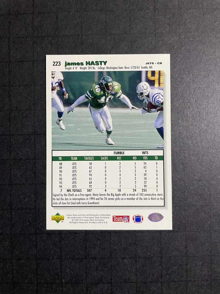 Material: Card Stock League: National Football League (NFL) Features: Parallel/Variety, Short Print Manufacturer: Upper Deck Team: Miami Dolphins, Buffalo Bills, New York Jets, Denver Broncos, New England Patriots, Kansas City Chiefs, Oakland Raiders, San Diego Chargers, Indianapolis Colts, Jacksonville Jaguars, Cincinnati Bengals, Pittsburgh Steelers, Cleveland Browns, Dallas Cowboys, New York Giants, Philadelphia Eagles, Washington Commanders, Tampa Bay Buccaneers, Atlanta Falcons, Carolina Panthers, San Francisco 49ers, Seattle Seahawks, Arizona Cardinals, Los Angeles Rams, Green Bay Packers, Detroit Lions, Minnesota Vikings, Chicago Bears Sport: Football Language: English Original/Licensed Reprint: Original Card Number: 223 Country/Region of Manufacture: United States Parallel/Variety: Players Club Autographed: No Player/Athlete: James Hasty Card Size: Standard Set: 1995 Upper Deck Collector's Choice Type: Sports Trading Card Season: 1995