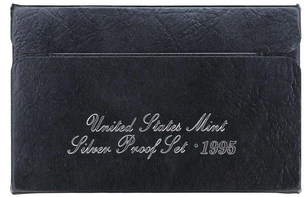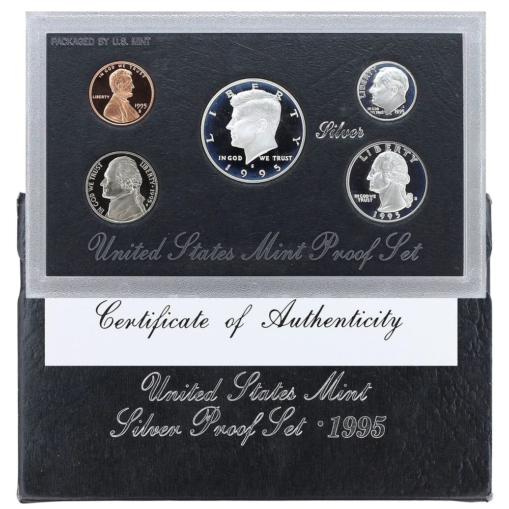 1995 United States Mint Silver Proof Set - 5 Coins - COA & OGP 90% Silver This 1995 Silver Proof Set contains 5 proof condition coins. This set contains the Lincoln Cent, Jefferson Nickel, Roosevelt Dime, Washington Quarter and Kennedy Half Dollar. The dime, quarter and half dollar are minted in 90% pure silver. This 1995 Silver Proof Set comes in like new condition, sealed in its plastic display case with a black background as packaged by the U.S. Mint, and includes the original Mint black cardboard envelope and Certificate of Authenticity.