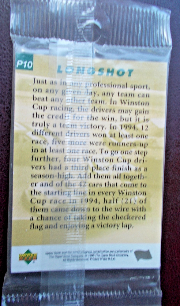 This is a 1995 U pper Deck Racing 10 card Predictor Set. Not sure exactly what drivers are in this set, but Rusty Wallace is the top card. Cards are still enclosed in sealed protective wrapper, NM condition. This set was a mail in prize for a contest Upper Deck had during the 1995 NASCAR season. Buyer will include $5.00 to cover shipping & tracking. Please pay within 3 days of purchase. Thanks for looking.