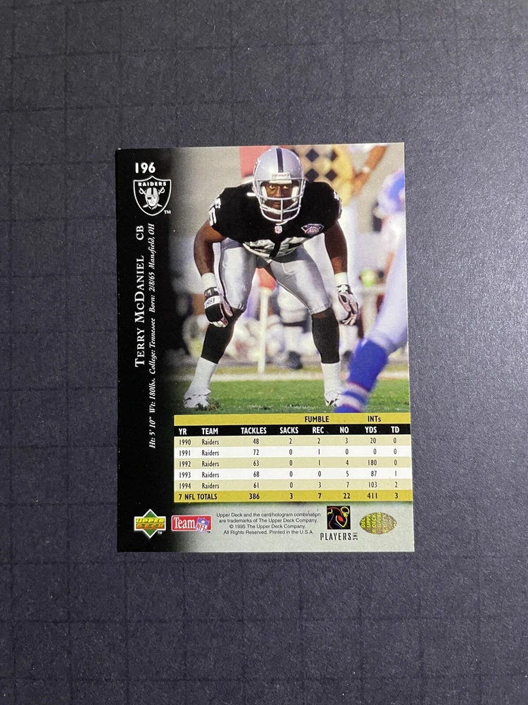 Country/Region of Manufacture: United States Original/Licensed Reprint: Original Sport: Football Manufacturer: Upper Deck Autographed: No Set: 1995 Upper Deck Language: English Material: Card Stock Team: Miami Dolphins, Buffalo Bills, New York Jets, Denver Broncos, New England Patriots, Kansas City Chiefs, Oakland Raiders, San Diego Chargers, Indianapolis Colts, Jacksonville Jaguars, Cincinnati Bengals, Pittsburgh Steelers, Cleveland Browns, Dallas Cowboys, New York Giants, Philadelphia Eagles, Washington Commanders, Tampa Bay Buccaneers, Atlanta Falcons, Carolina Panthers, San Francisco 49ers, Seattle Seahawks, Arizona Cardinals, Los Angeles Rams, Green Bay Packers, Detroit Lions, Minnesota Vikings, Chicago Bears Season: 1995 Card Number: 196 Parallel/Variety: Silver League: National Football League (NFL) Card Size: Standard Type: Sports Trading Card Features: Parallel/Variety, Short Print Player/Athlete: Terry McDaniels