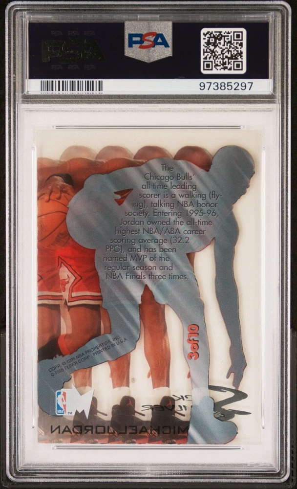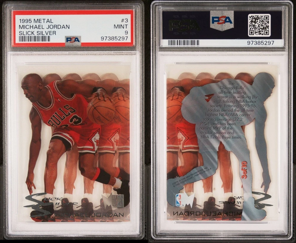 This rare and valuable sports trading card features one of the greatest basketball players of all time, Michael Jordan, in a stunning Slick Silver parallel variety. The 1995-96 Metal card #3 is certified by a Professional Sports Authenticator (PSA) with a grade of 9, making it a highly sought-after item for collectors and fans alike.The card is manufactured by Fleer and features an insert design. It is a must-have for any fan of the Chicago Bulls or sports trading cards in general. Don't miss your chance to add this rare and valuable card to your collection today.