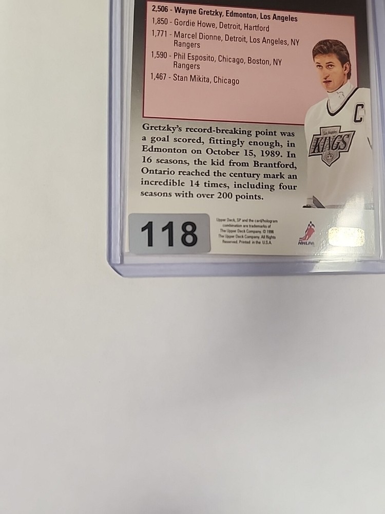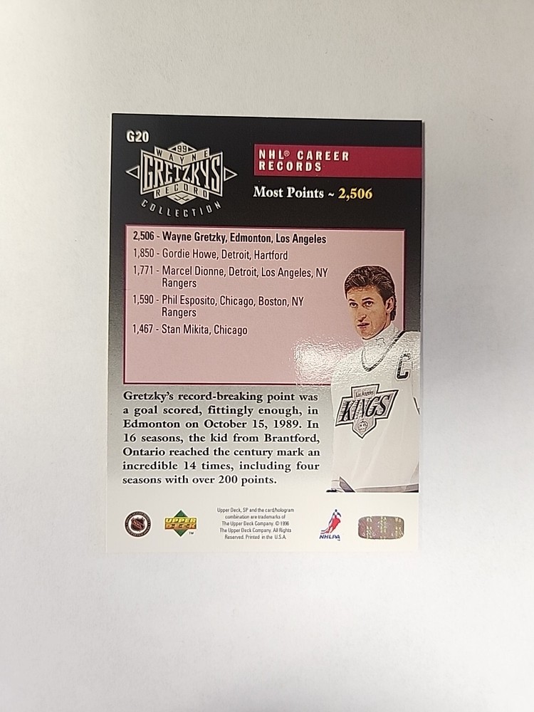Capture a piece of ice hockey history with the 1995-96 Upper Deck Gretzky Collection #G20 card featuring the legendary Wayne Gretzky. Representing his time with the Los Angeles Kings, this collectible showcases the prowess of one of the National Hockey League's (NHL) greatest centers of all time. The card, produced by renowned manufacturer Upper Deck, is part of a revered set that honors Gretzky's illustrious career. Proudly made in the United States, the card is crafted from premium card stock and is an original issue, not a reprint. It's an ungraded piece, offering you the opportunity to assess its quality and value. With its insert feature, this card stands out as a notable collectible for fans of the sport or collectors of sports memorabilia.