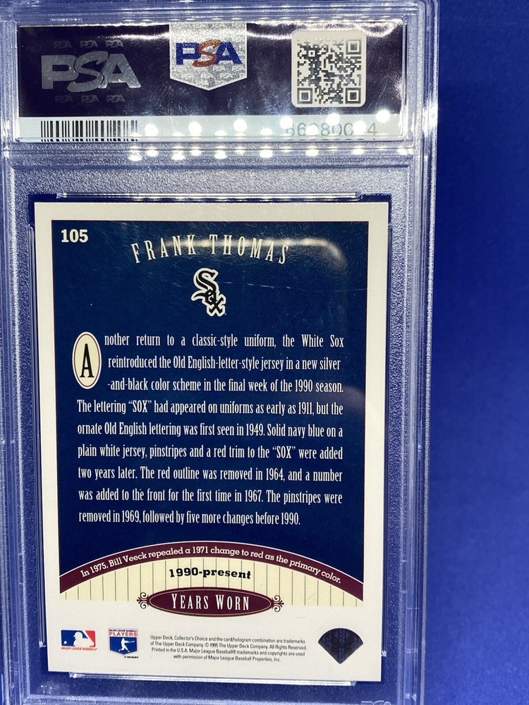 Dive into the world of sports memorabilia with the 1996 Collector's Choice Traditional Threads #105 featuring the legendary Frank Thomas of the Chicago White Sox. The card has been meticulously graded by the Professional Sports Authenticator (PSA), earning a Gem Mint 10 rating, the highest possible grade, indicating its pristine and collectible quality. The card comes from the esteemed 1996 Upper Deck Collector's Choice set, renowned for its exquisite craftsmanship and attention to detail. It is a non-autographed insert that reflects the excellence and legacy of Frank Thomas's career in Major League Baseball (MLB).
