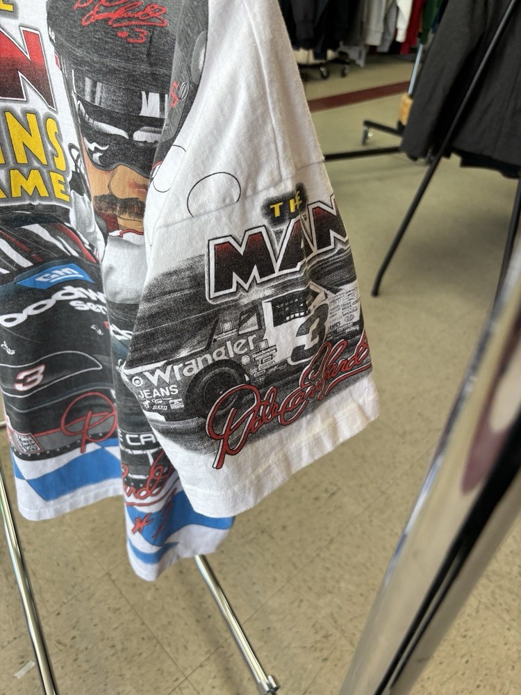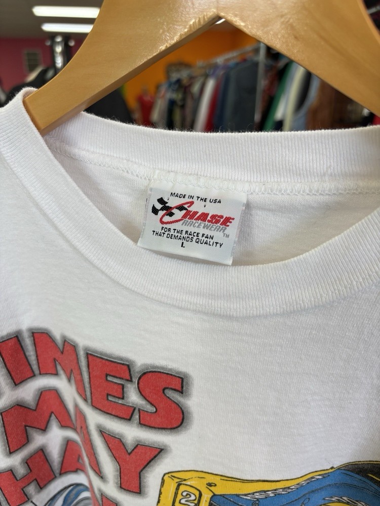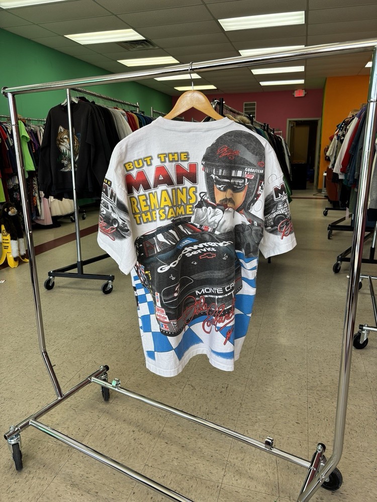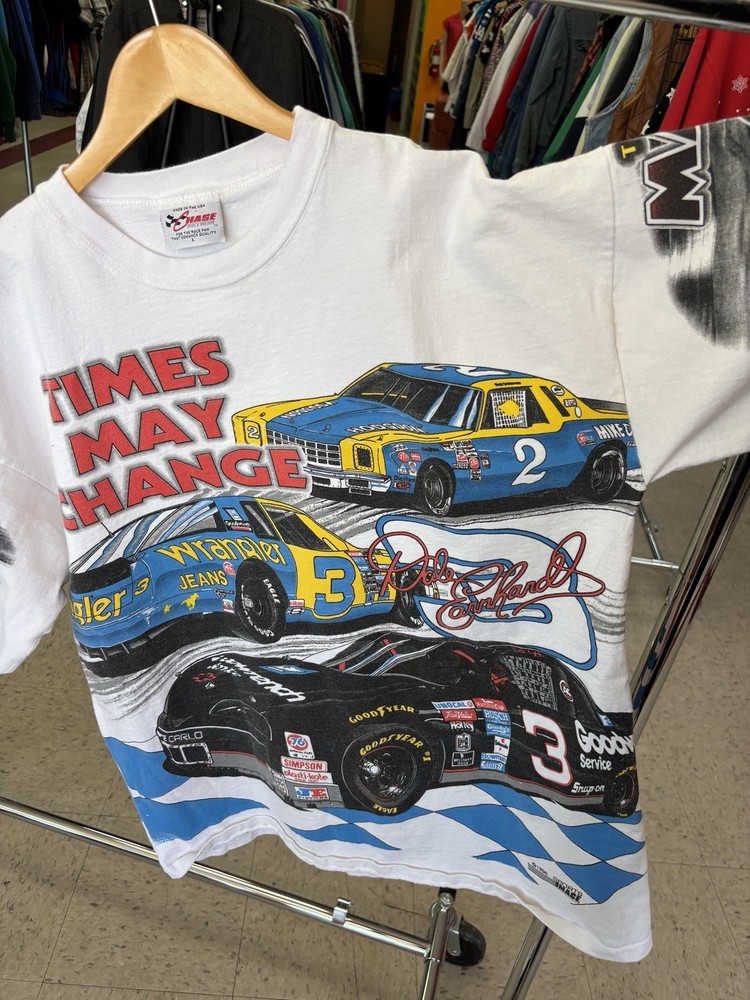 The product is a vintage 1996 Dale Earnhardt "Times May Change" T-shirt in size XL. The shirt is officially licensed by NASCAR and features the iconic driver, Dale Earnhardt, who raced for Earnhardt Ganassi Racing. This white shirt is a must-have for fans of auto racing, specifically NASCAR, and men who appreciate the legacy and impact of Dale Earnhardt on the sport. Perfect for showing support for the legendary driver and his team, this shirt is a timeless piece of racing memorabilia.